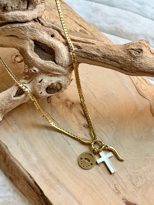 Mother of Pearl Cross + Gold Stainless Steel Necklace
