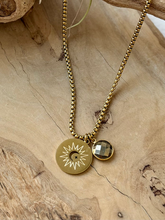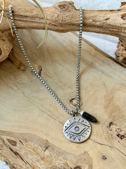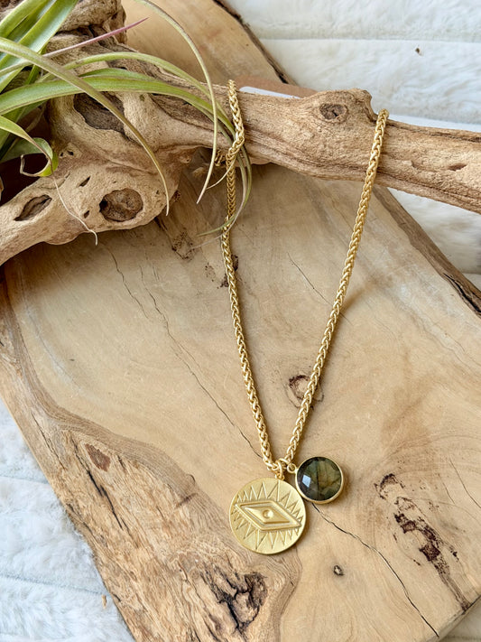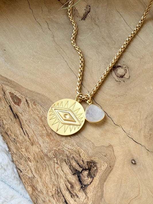 Rainbow Moonstone + Matte Gold Evil Eye Necklace