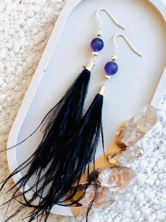 Amethyst + Silver Black Feather Earrings