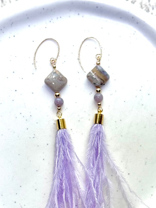 Amethyst Sage Agate + Gold Lavender Feather Earrings