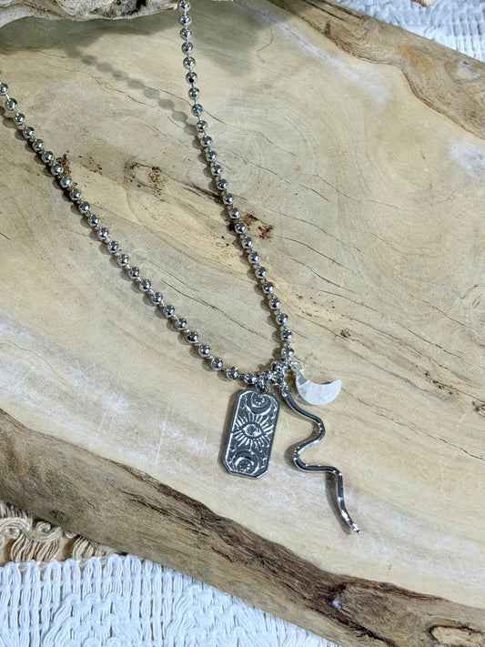 Rainbow Moonstone Moon + Silver Carabiner Charm Necklace