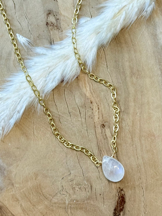 Rainbow Moonstone Teardrop + Matte Gold Necklace