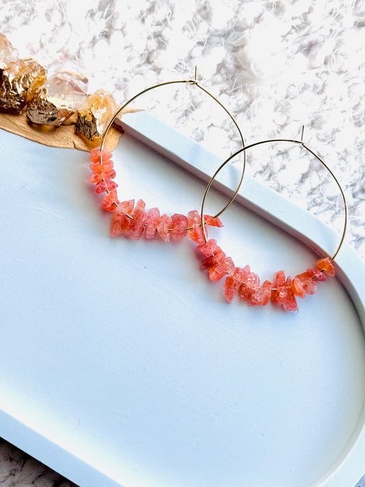 Red Hematoid Quartz + Gold Blush/Brown Feather Earrings