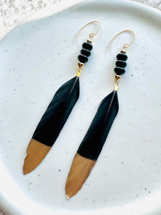 Black Onyx + Gold Feather Earrings