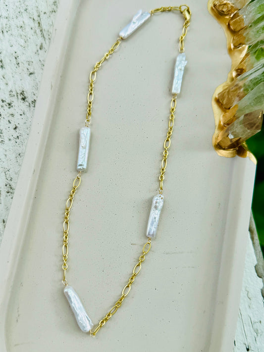 Biwa Stick Pearl + Matte Gold Chain Necklace
