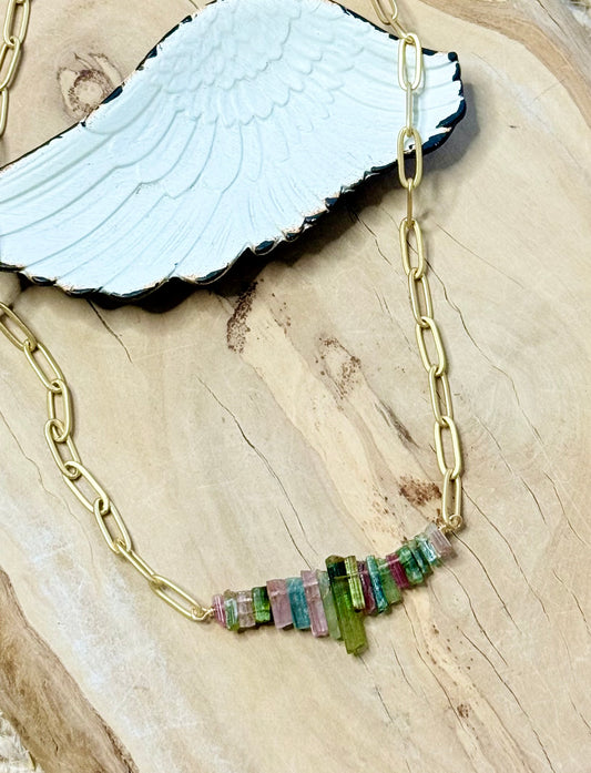 Watermelon Tourmaline + Matte Gold Necklace