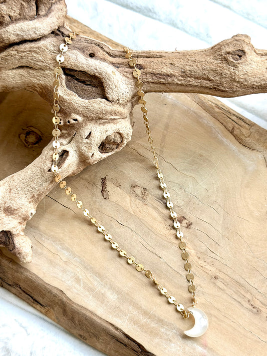 White Moonstone + Matte Gold Moon Necklace