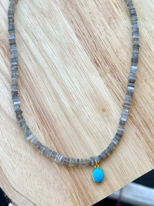 Gray Moonstone + Turquoise Gold Beaded Necklace
