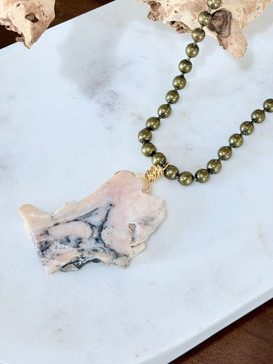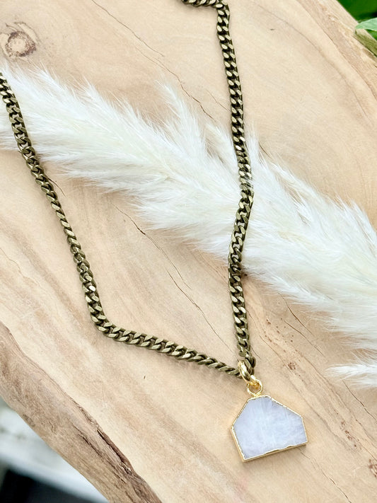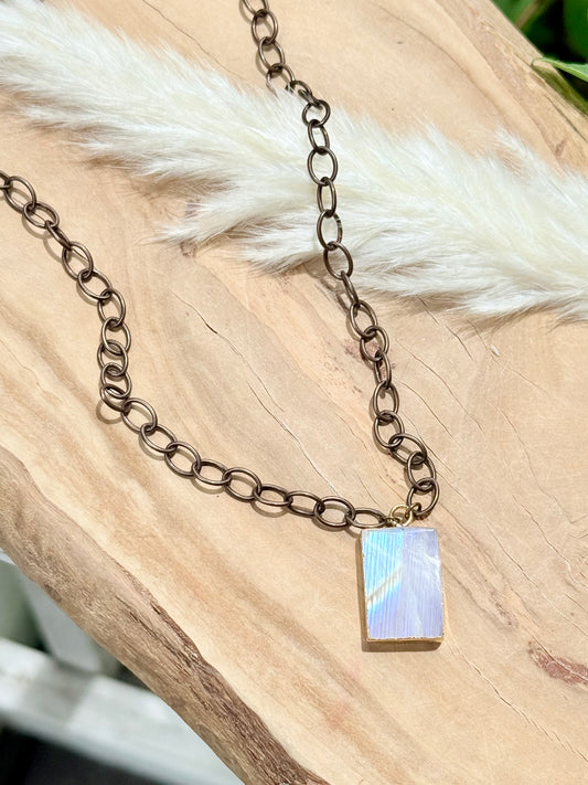 Rainbow Moonstone Rectangle + Antique Bronze Necklace