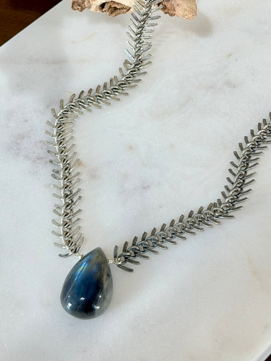 Labradorite + Antique Silver Fishbone Necklace
