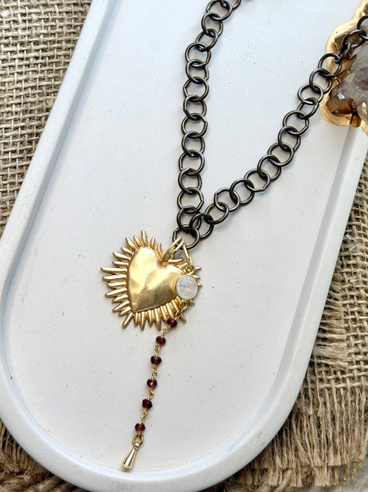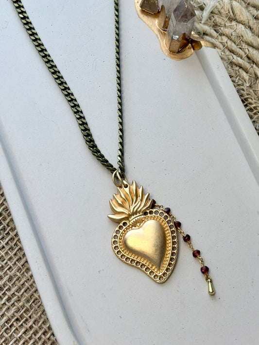 Matte Gold Sacred Heart + Garnet Antique Brass Necklace