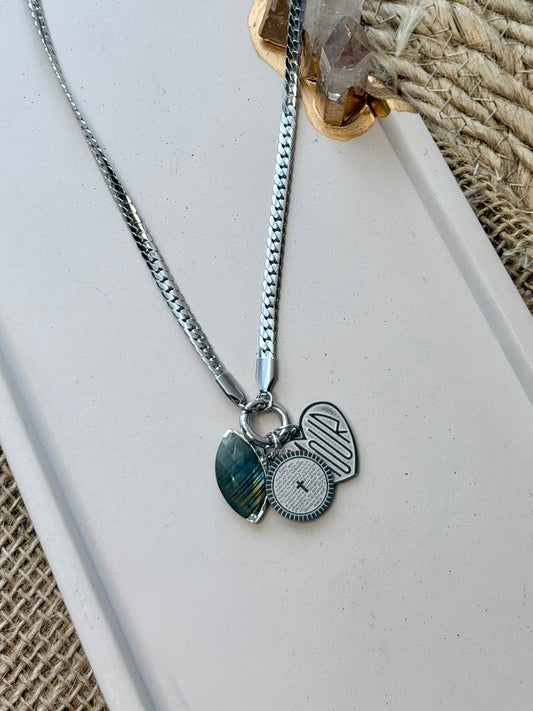 Labradorite Evil Eye + Silver Carabiner Charm Necklace