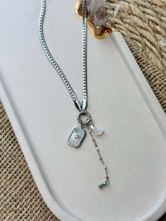 Rainbow Moonstone Moon + Silver Carabiner Charm Necklace