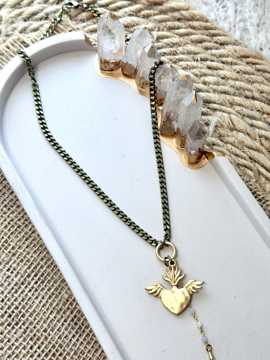 Matte Gold Winged Heart + Moonstone Antique Brass Necklace