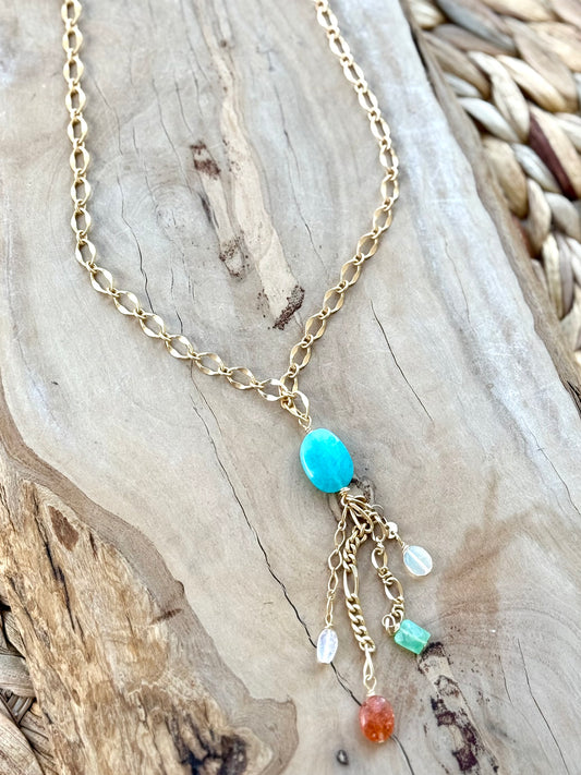 Peruvian Amazonite + Matte Gold Lariat Necklace