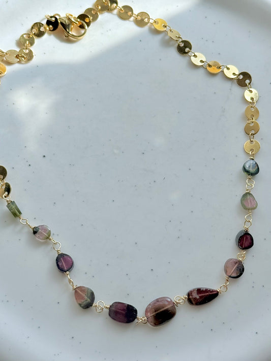 Multi-Color Watermelon Tourmaline + Gold Sequin Necklace