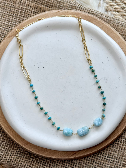 Gray Moonstone + Turquoise Gold Beaded Necklace
