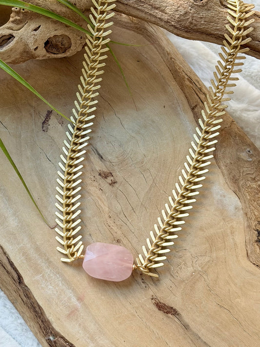 Rose Quartz + Matte Gold Fishbone Chain Necklace
