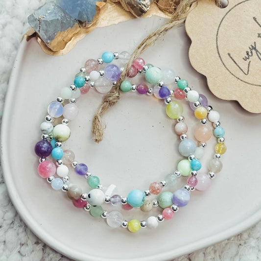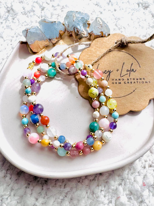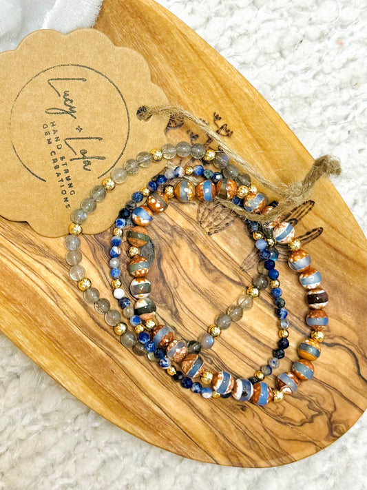 Tibetan Agate, Sodalite + Labradorite in Gold (3-stack)