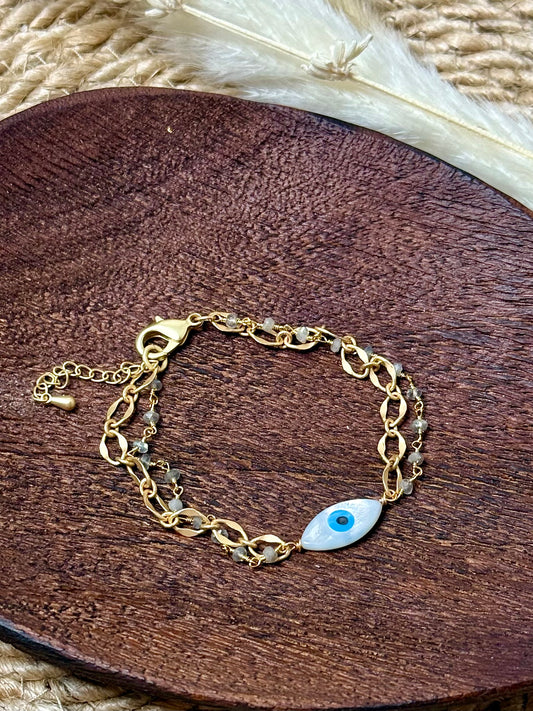 Mother of Pearl Evil Eye + Labradorite Matte Gold Chain Bracelet