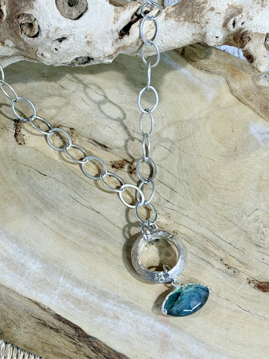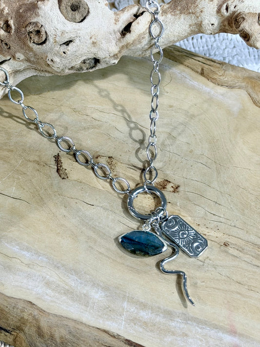 Labradorite Evil Eye + Silver Carabiner Charm Necklace