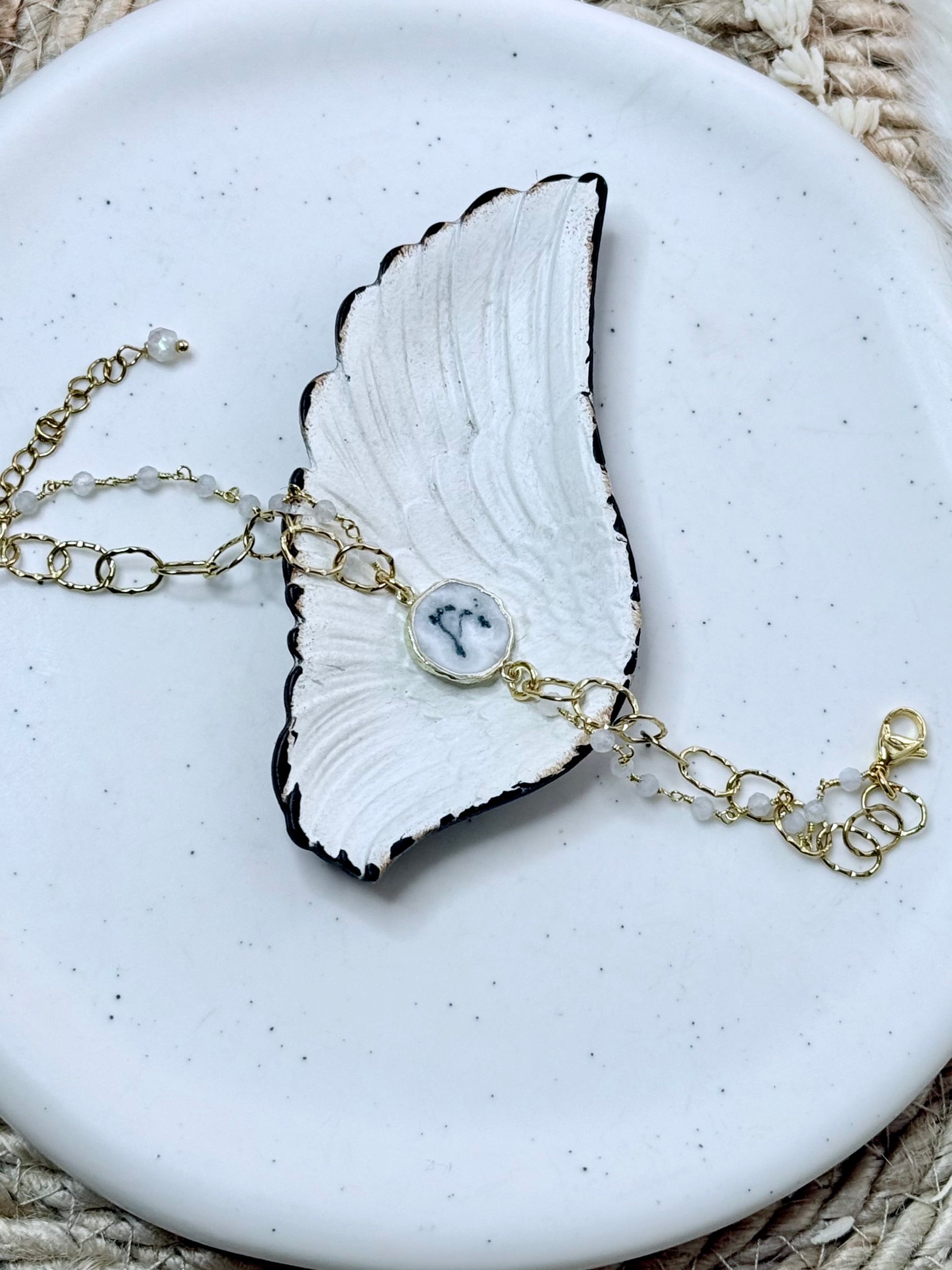 - Includes an agate pendant with rainbow moonstone beaded chains