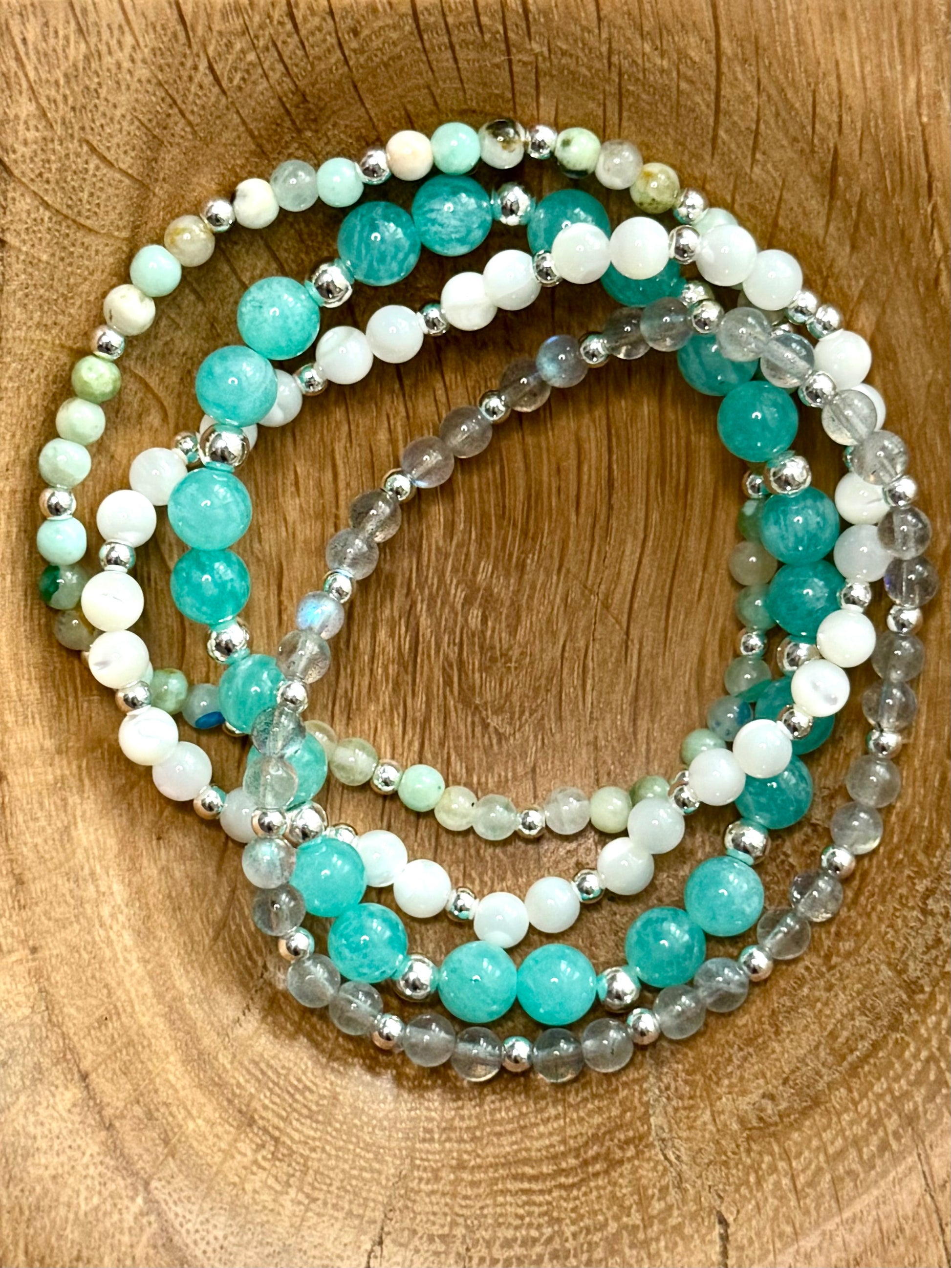- Beads include: Peruvian amazonite, labradorite, chrysocolla, mother of pearl