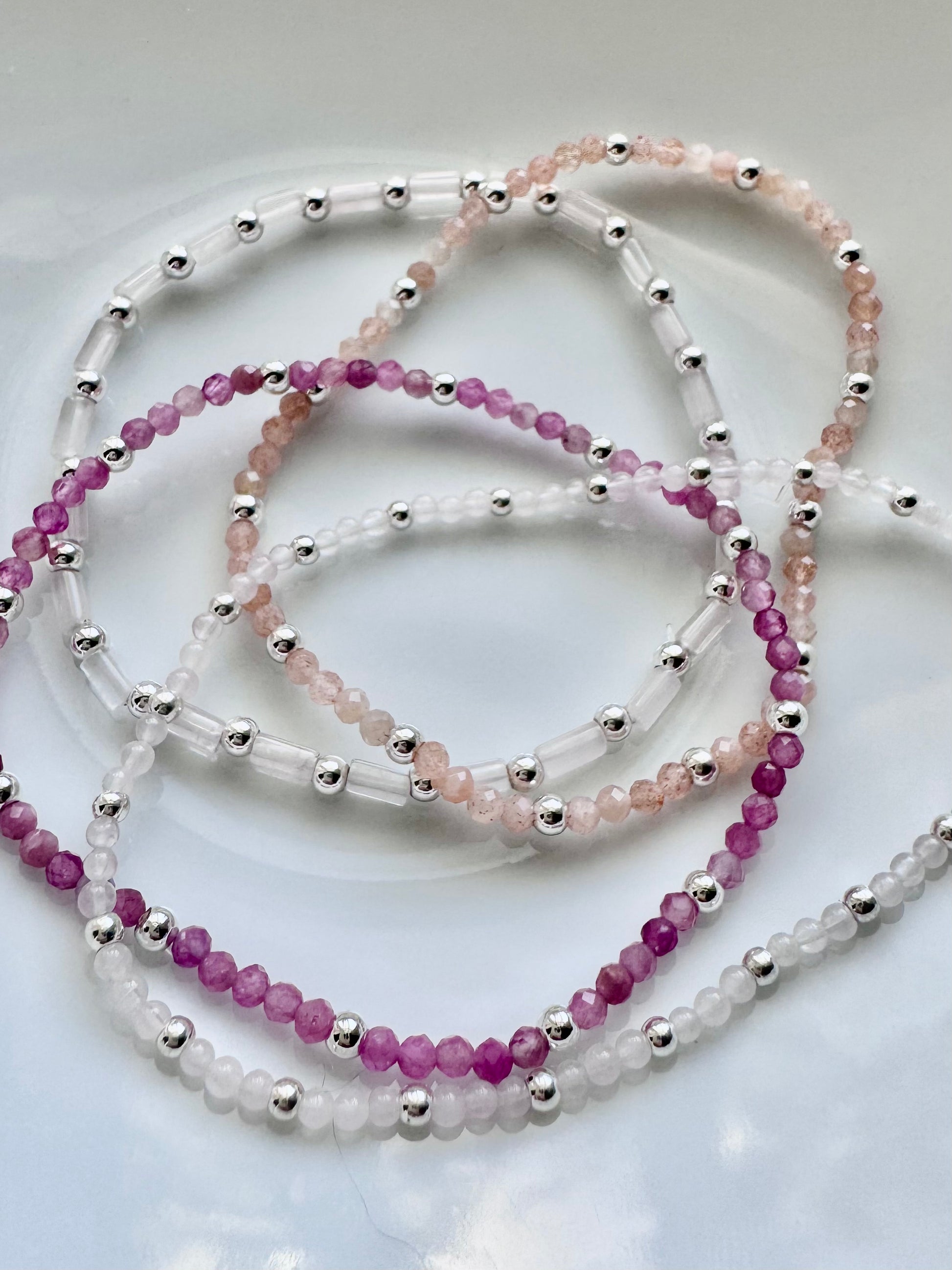 - Beads include: rose quartz, peach moonstone and pink tourmaline