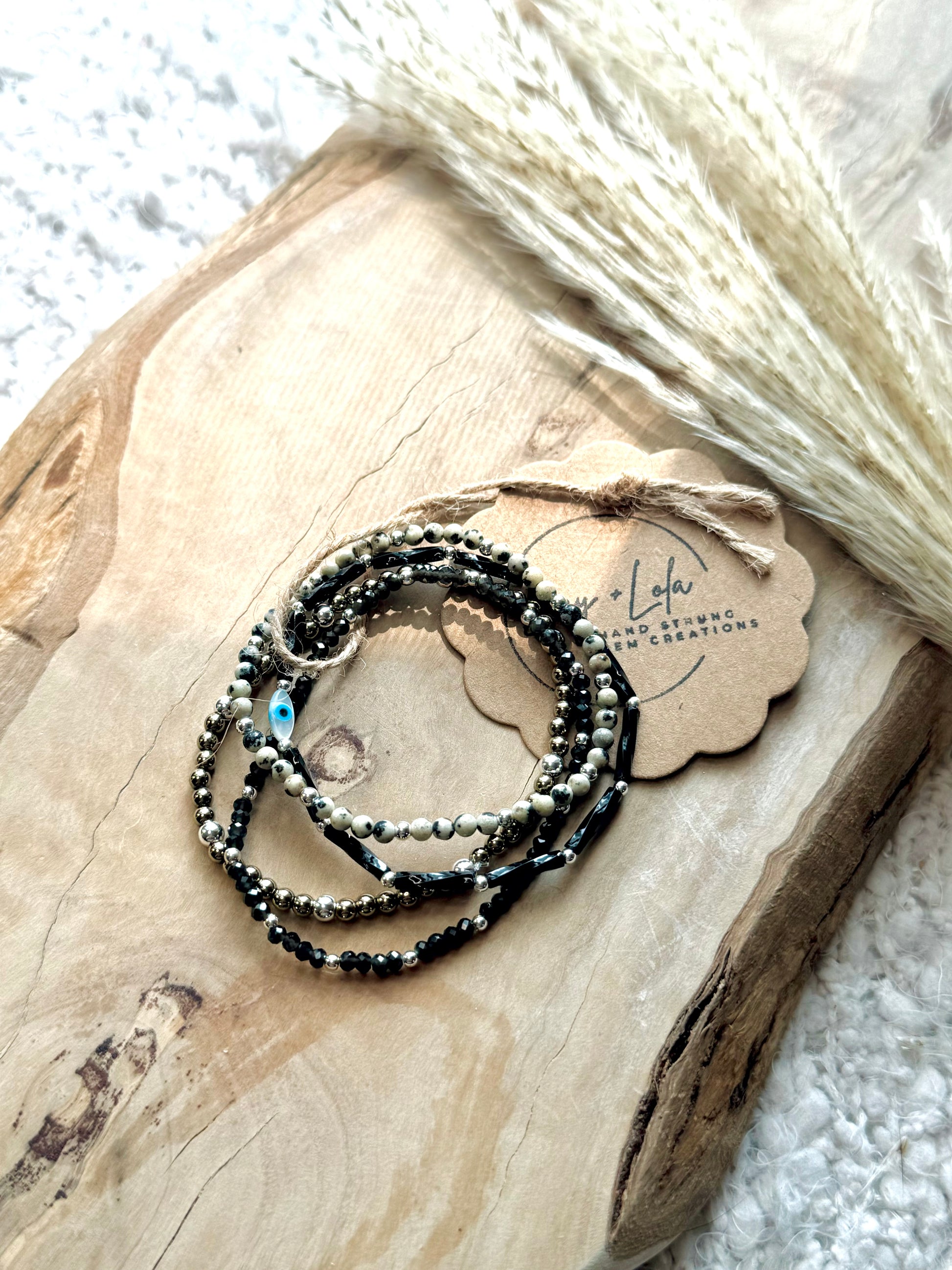 - Beads include: black obsidian, dalmatian jasper, black onyx, champagne hematite, Czech glass + mother of pearl evil eye bead