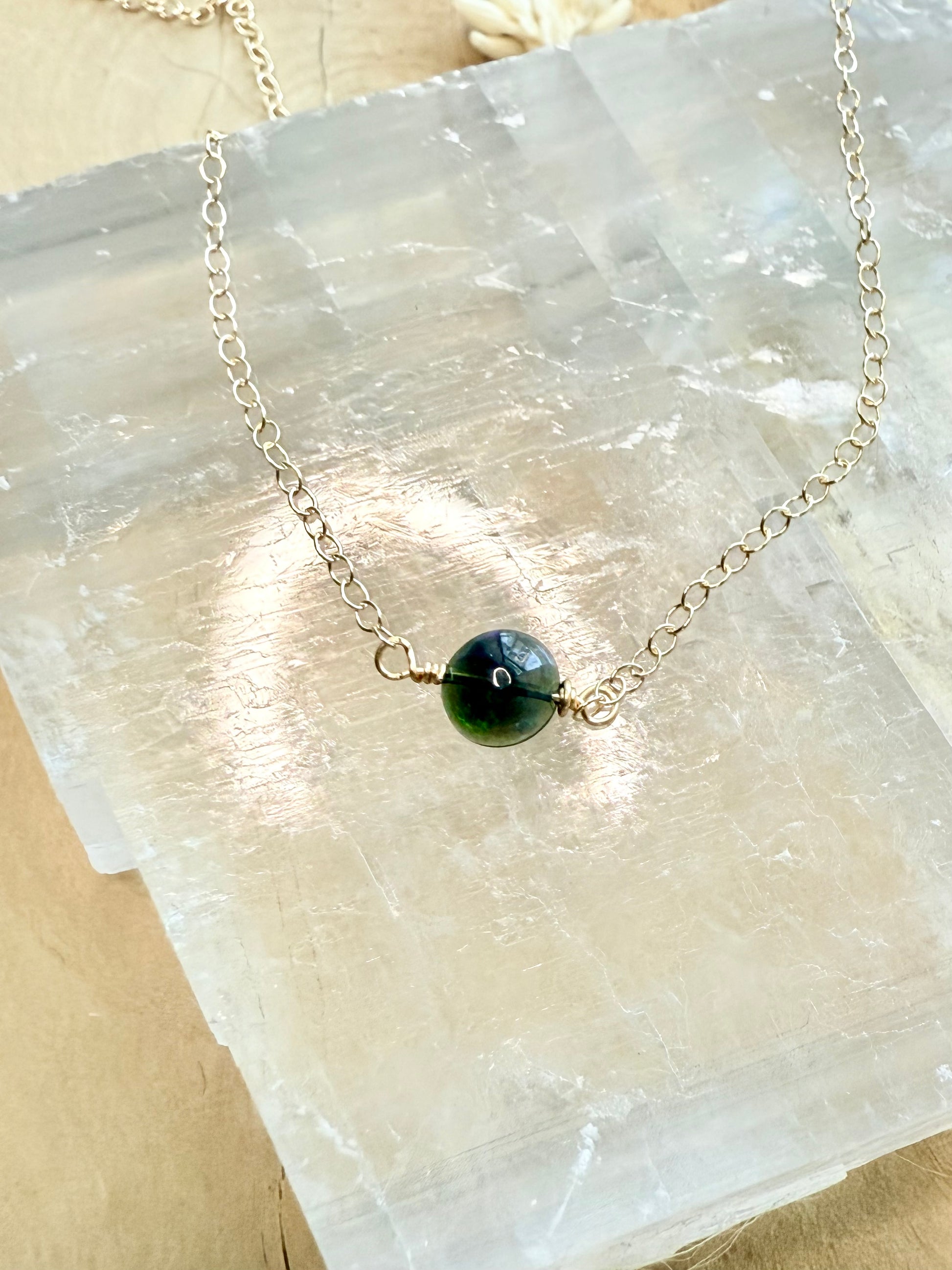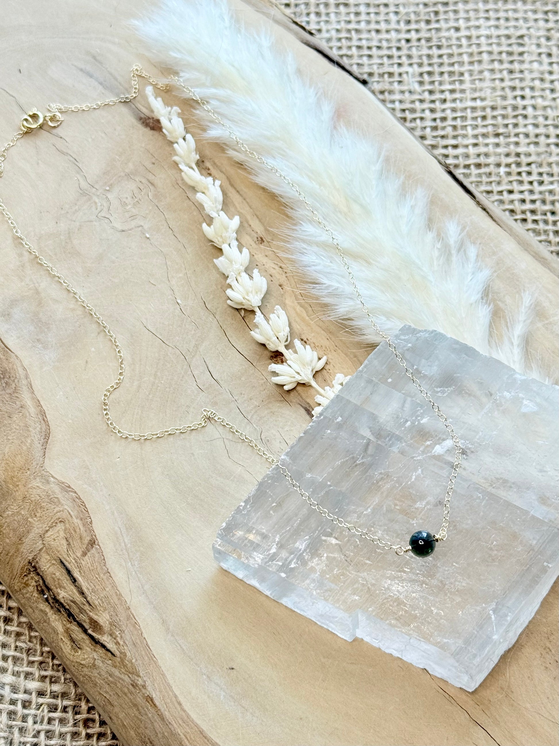 - 18-inch 14k gold filled, chain with a flashy, black Ethiopian opal pendant