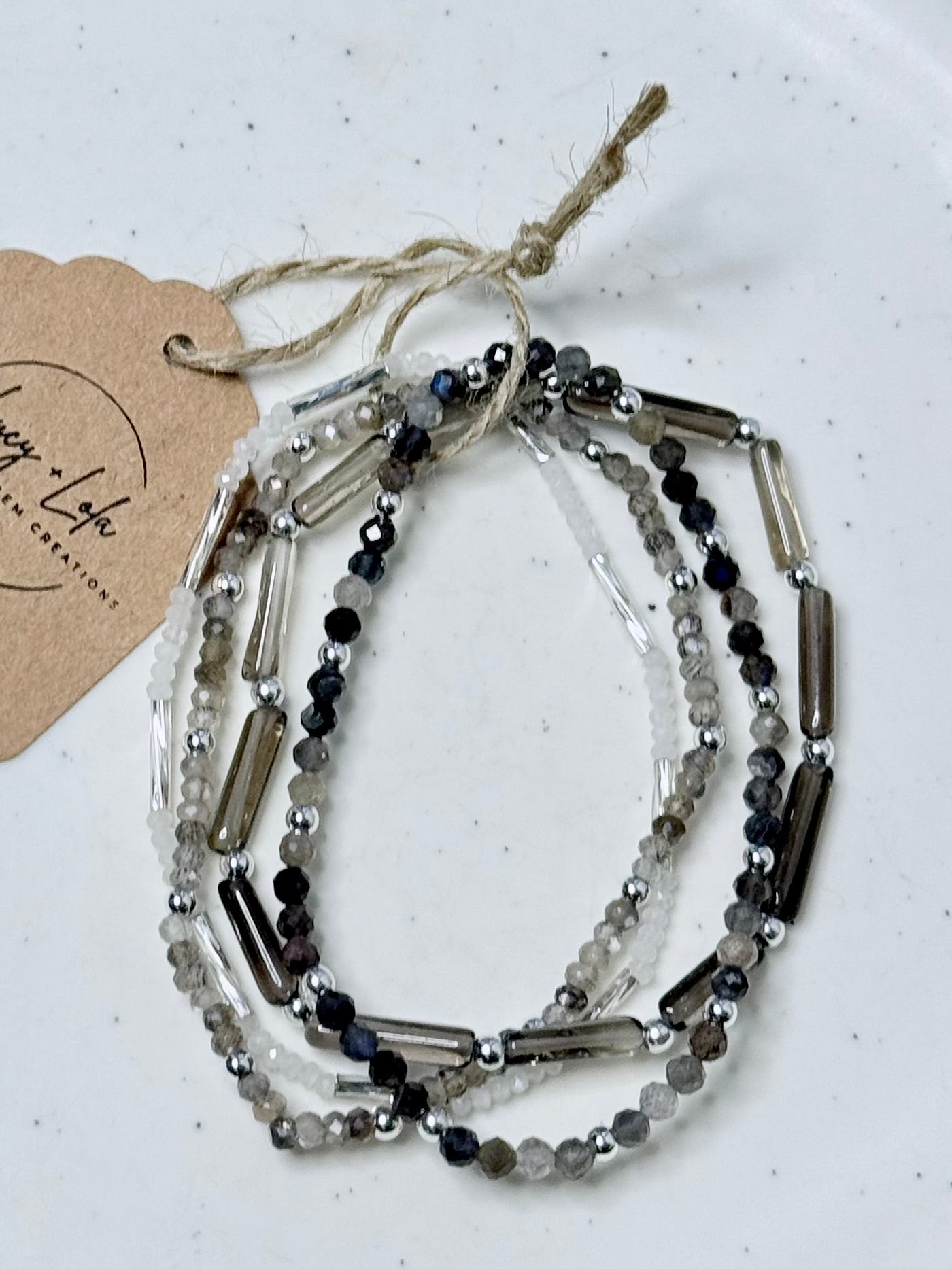 - Beads include: smoky quartz, labradorite, gray moonstone, white moonstone, Czech glass