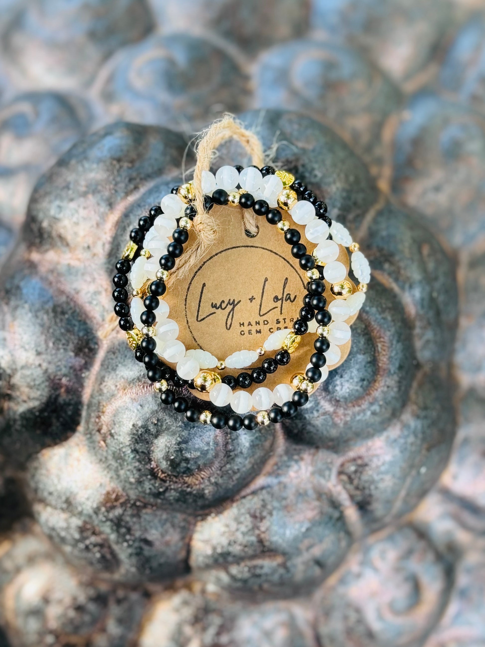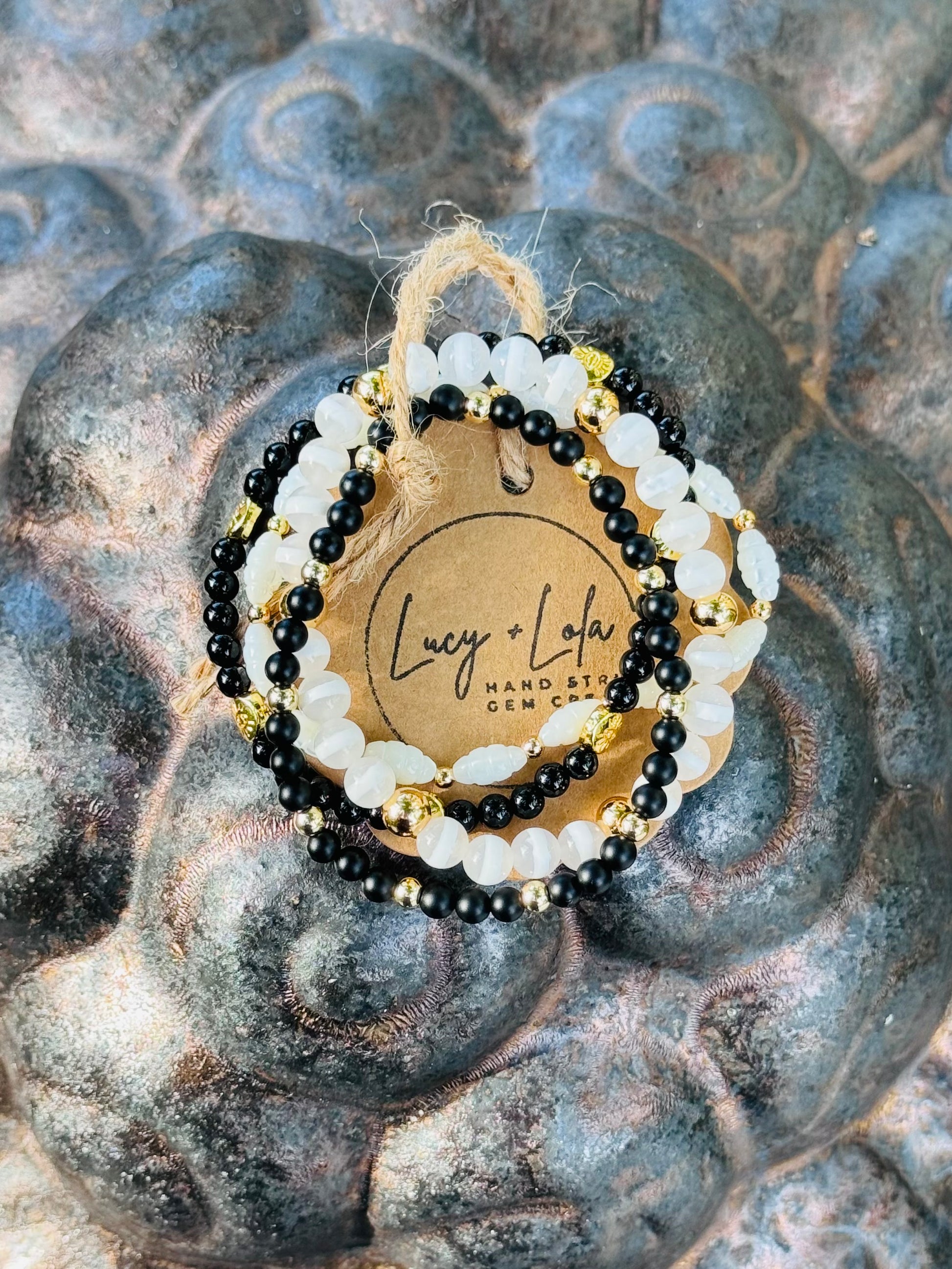 - Beads include: Matte black onyx, black onyx with gold plated evil eye beads, Tibetan agate + mother of pearl