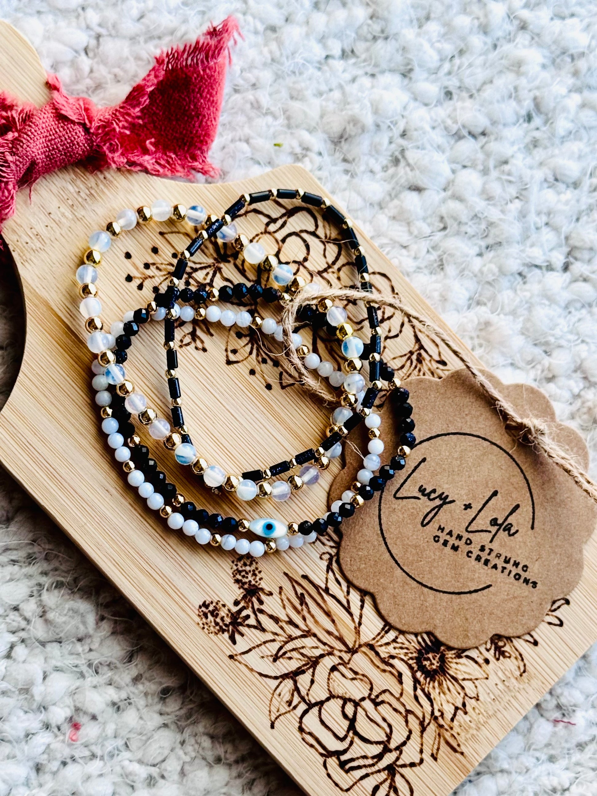 - Beads include: blue goldstone, blue lace agate, opalite + a mother of pearl evil eye bead