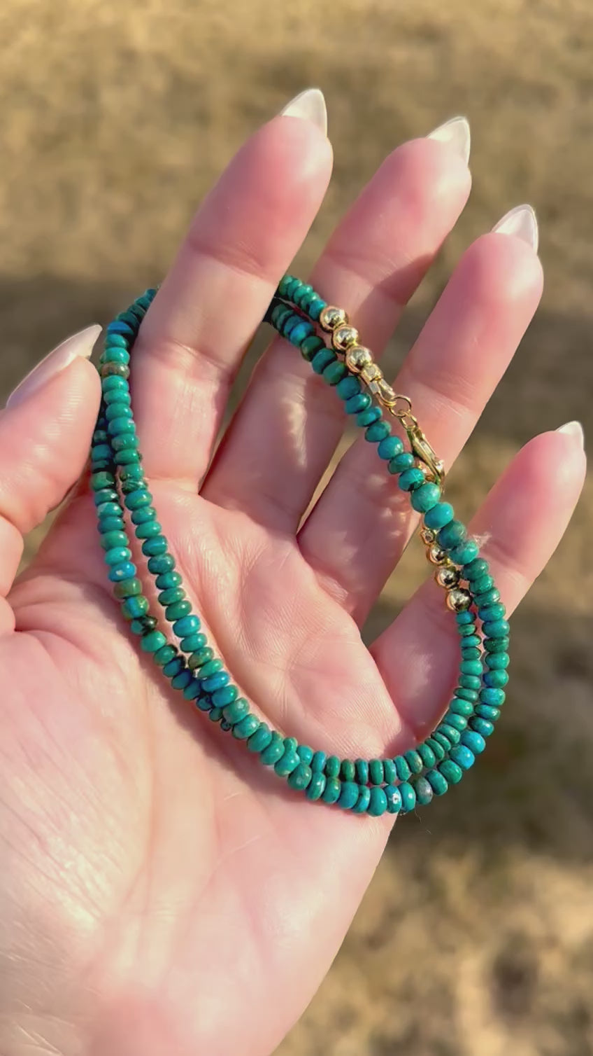 - Stunning, high-grade blue opal-lime gemstones, with gold filled accent beads