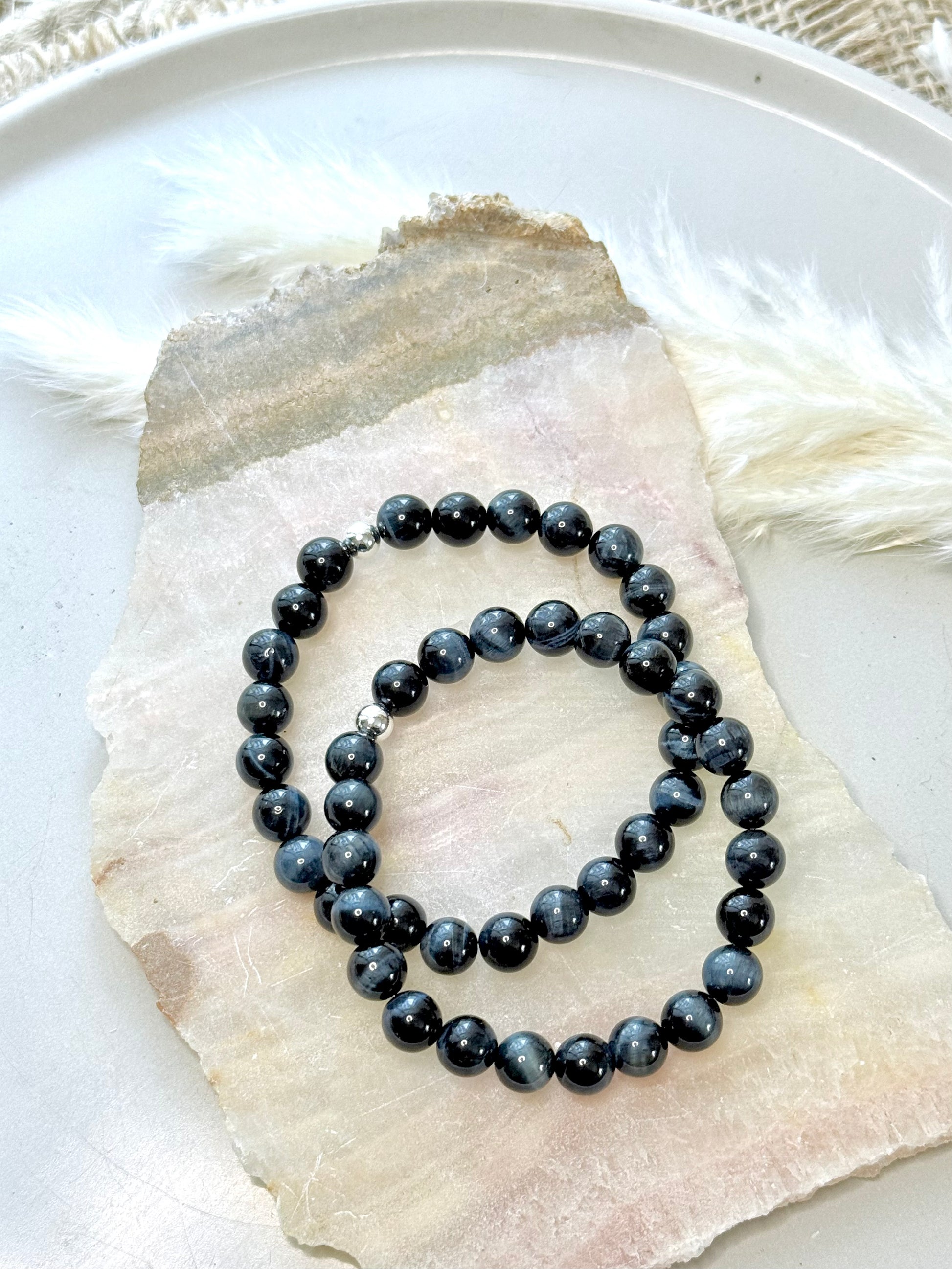- Includes blue tiger eye gemstones and a silver spacer bead