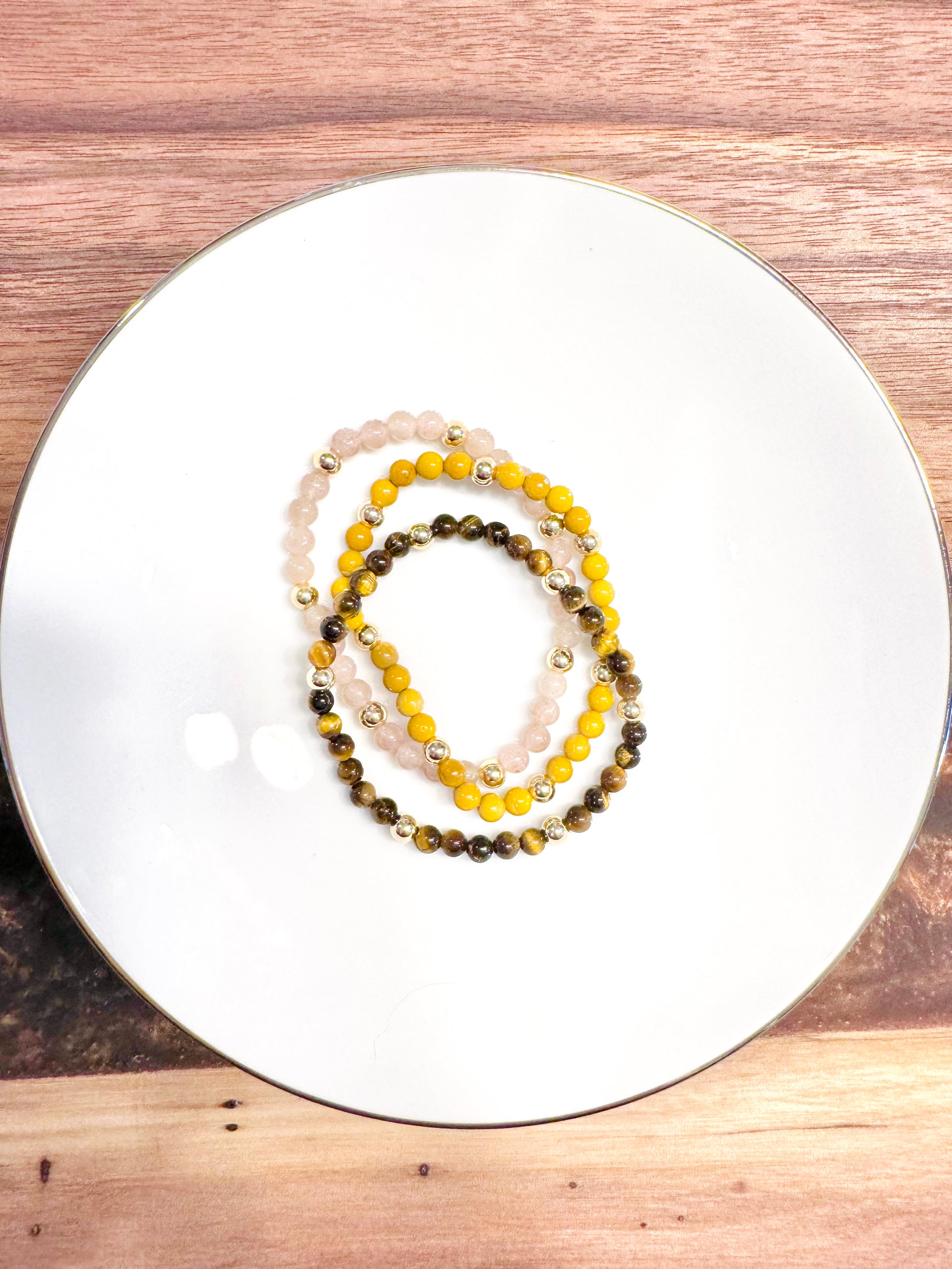 - Beads include yellow jasper, tiger eye and strawberry quartz