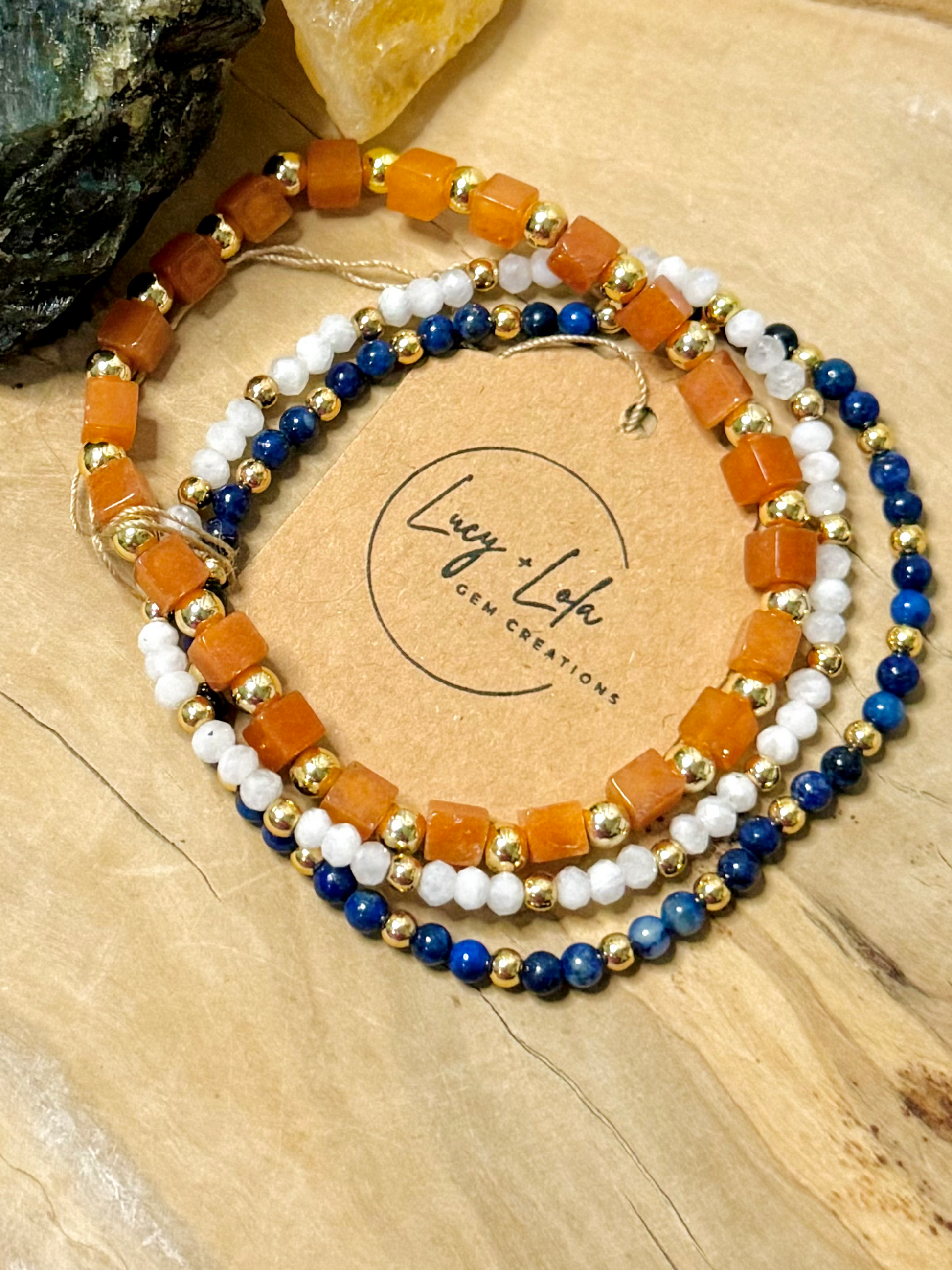- Beads include: moonstone, lapis lazuli + red aventurine