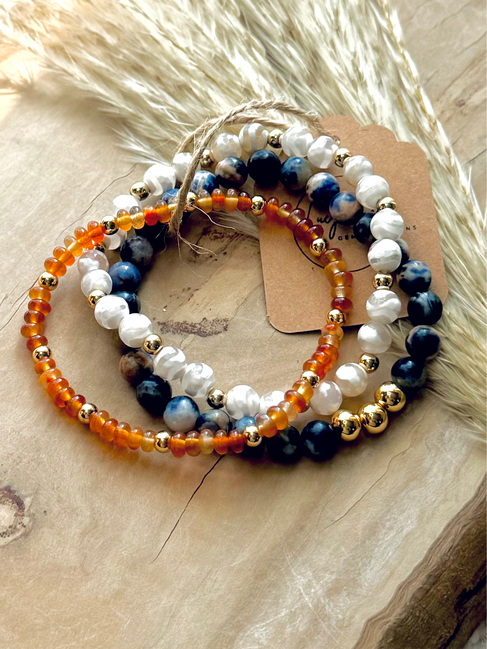 - Beads include: carnelian, sodalite + Tibetan agate