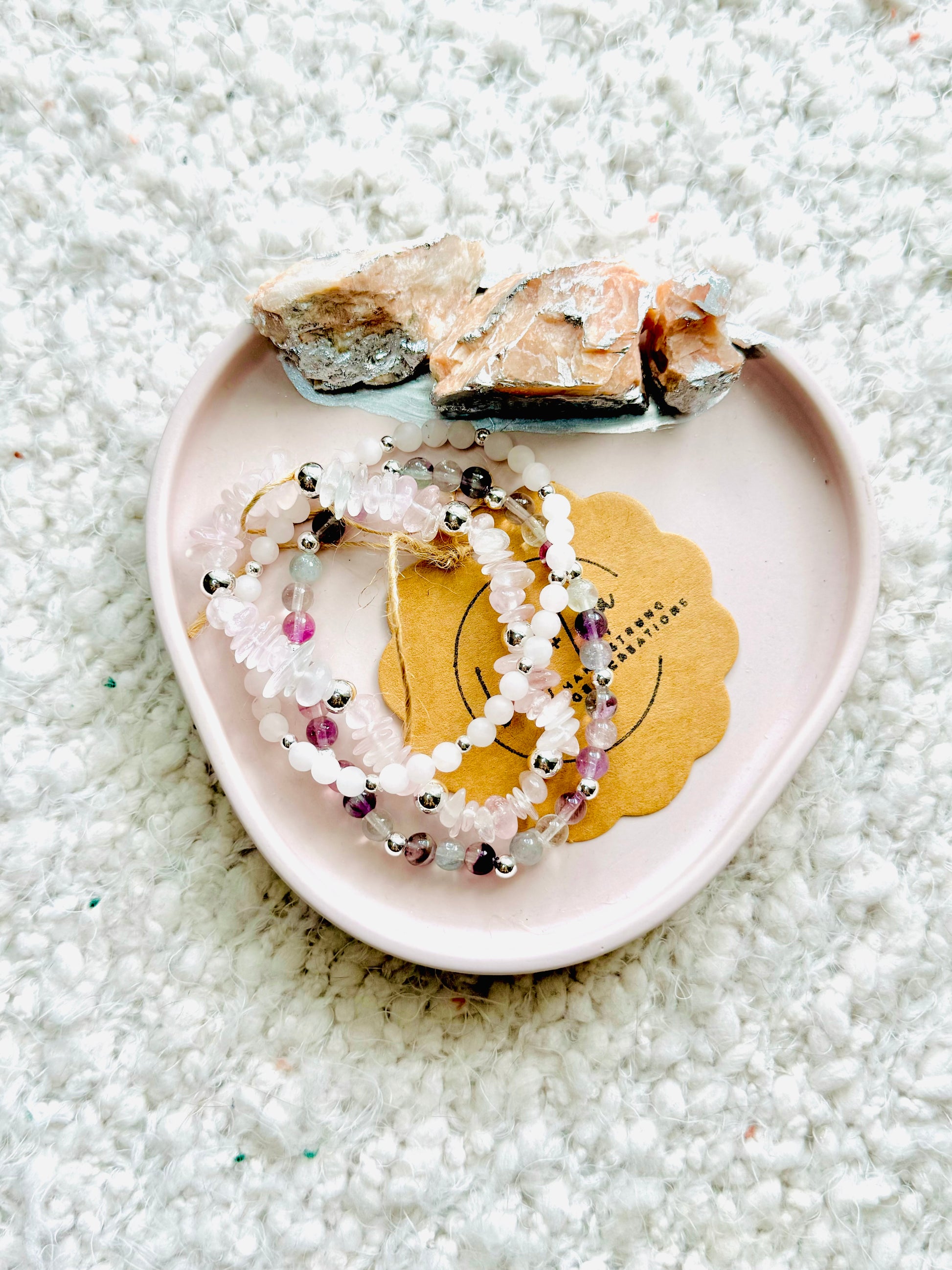 - Beads include: rose quartz, matte rose quartz + fluorite