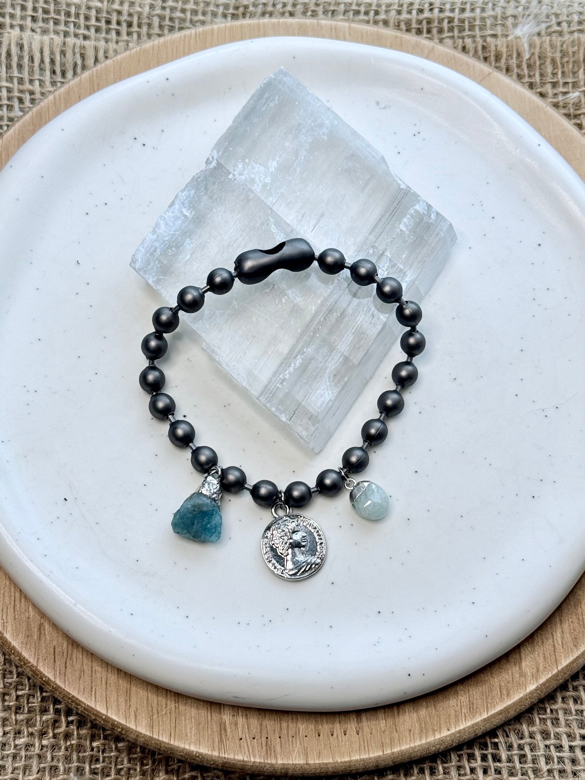 Chunky Matte Gunmetal Ball + Silver Coin Charm Bracelet