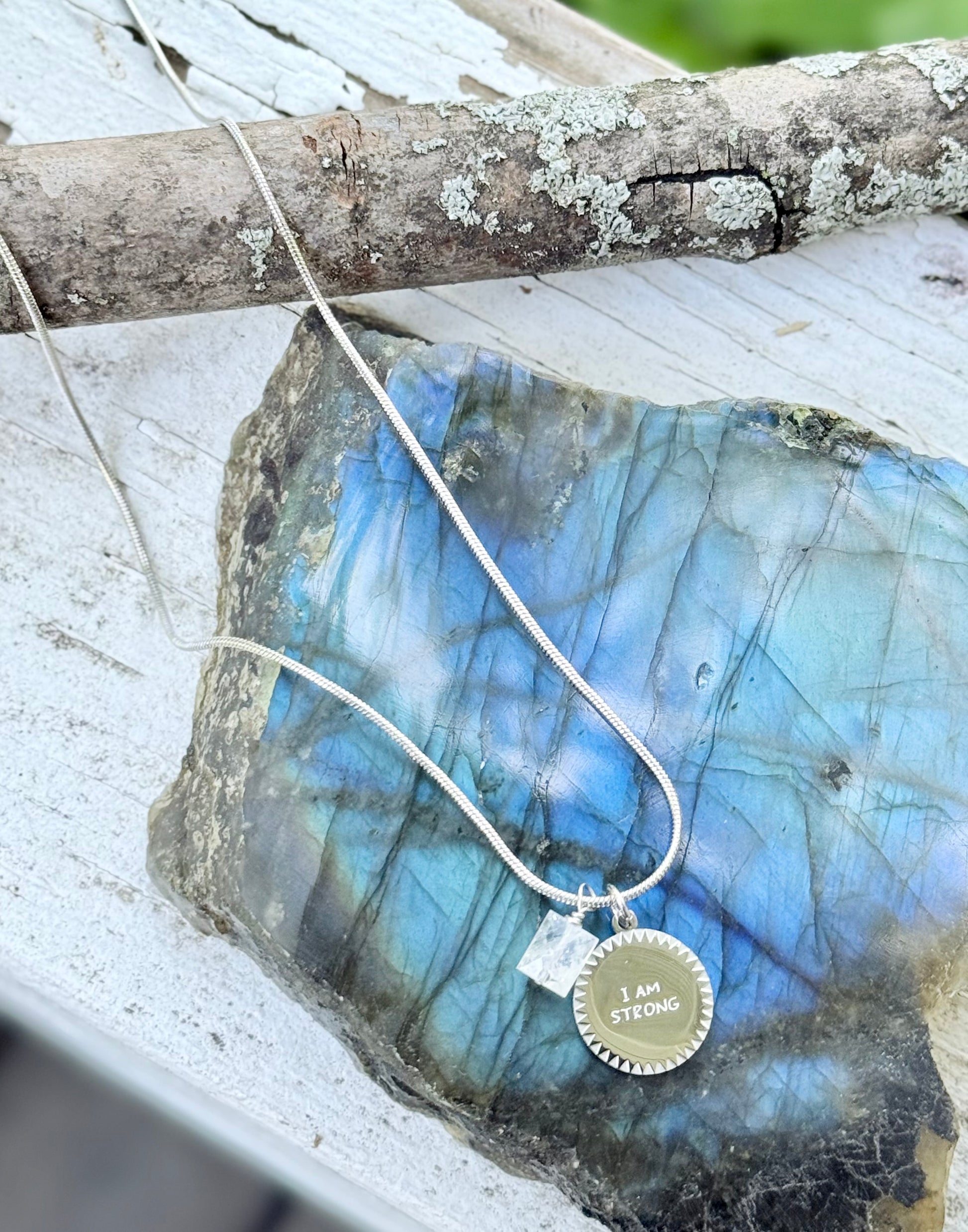 - Includes a stainless steel pendant with the wording "I AM STRONG" and a moonstone pendant for strength