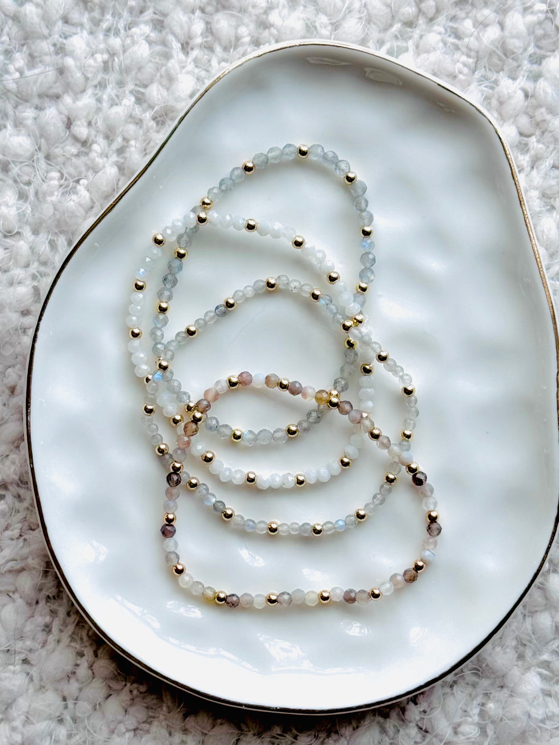 - Beads include: Botswana agate, labradorite, moonstone
