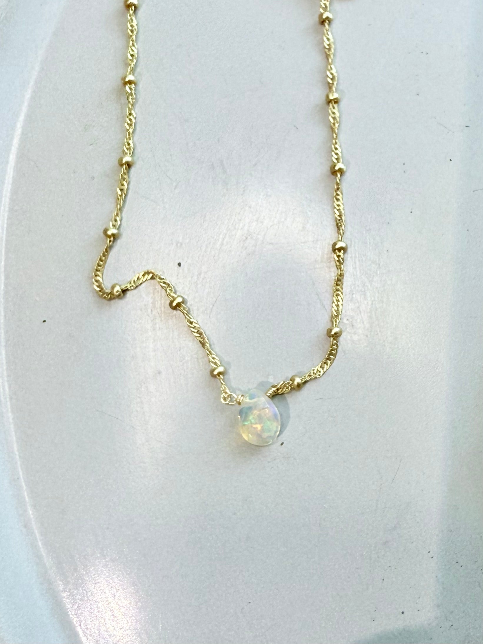 - 18-inch matte gold plated chain with a flashy, golden Ethiopian opal pendant