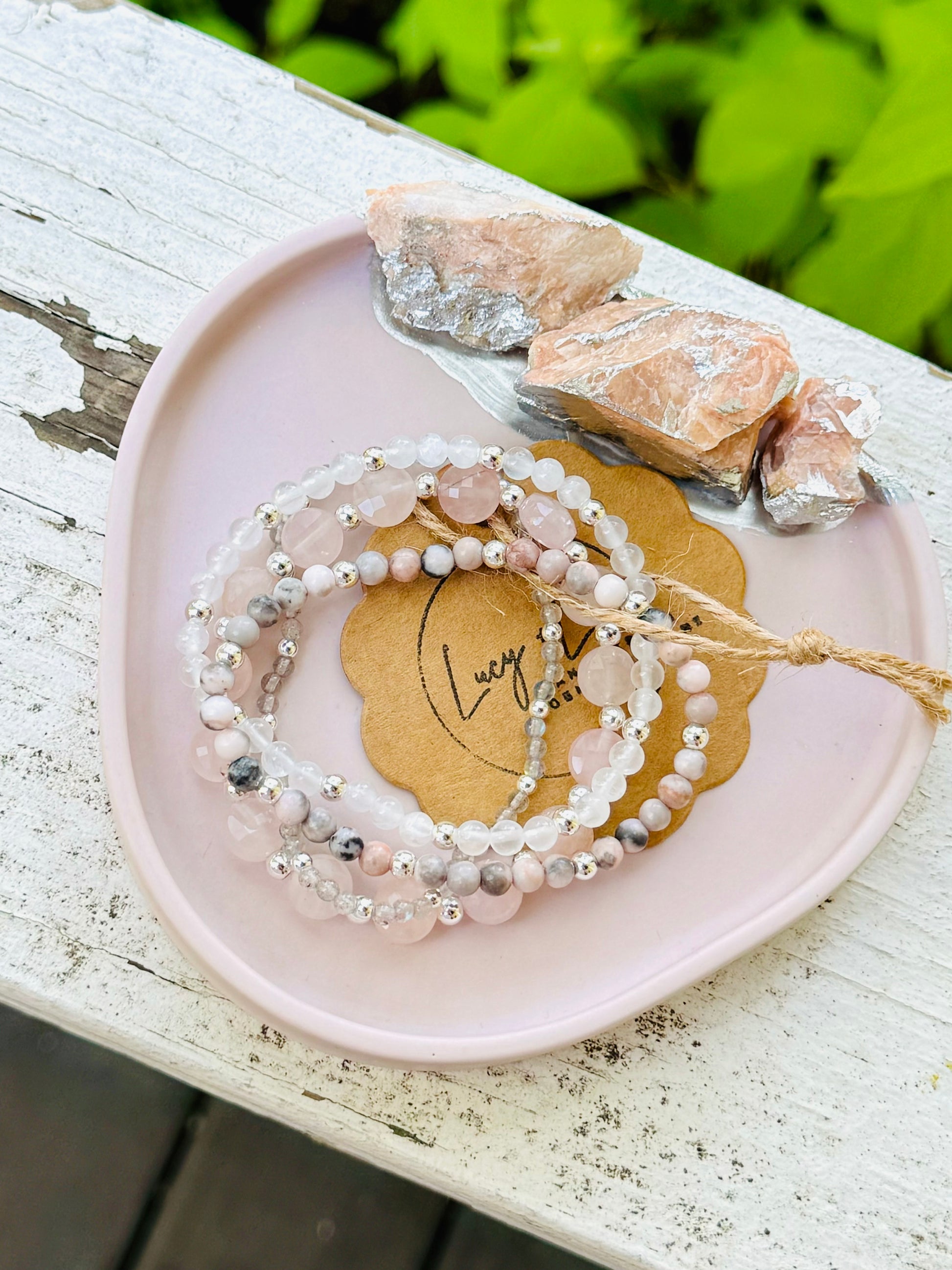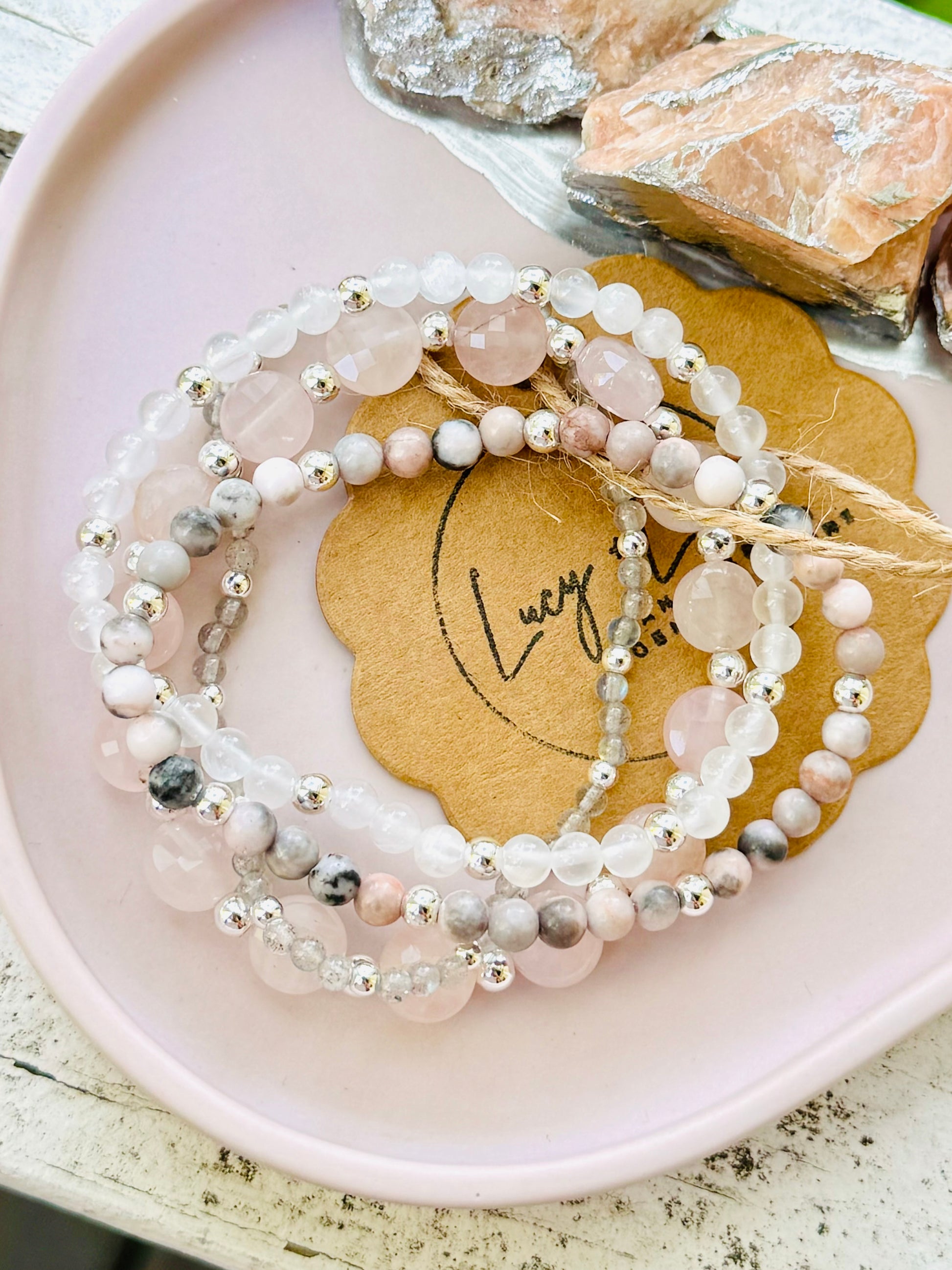 - Beads include: pink zebra Jasper, rose quartz, selenite + labradorite