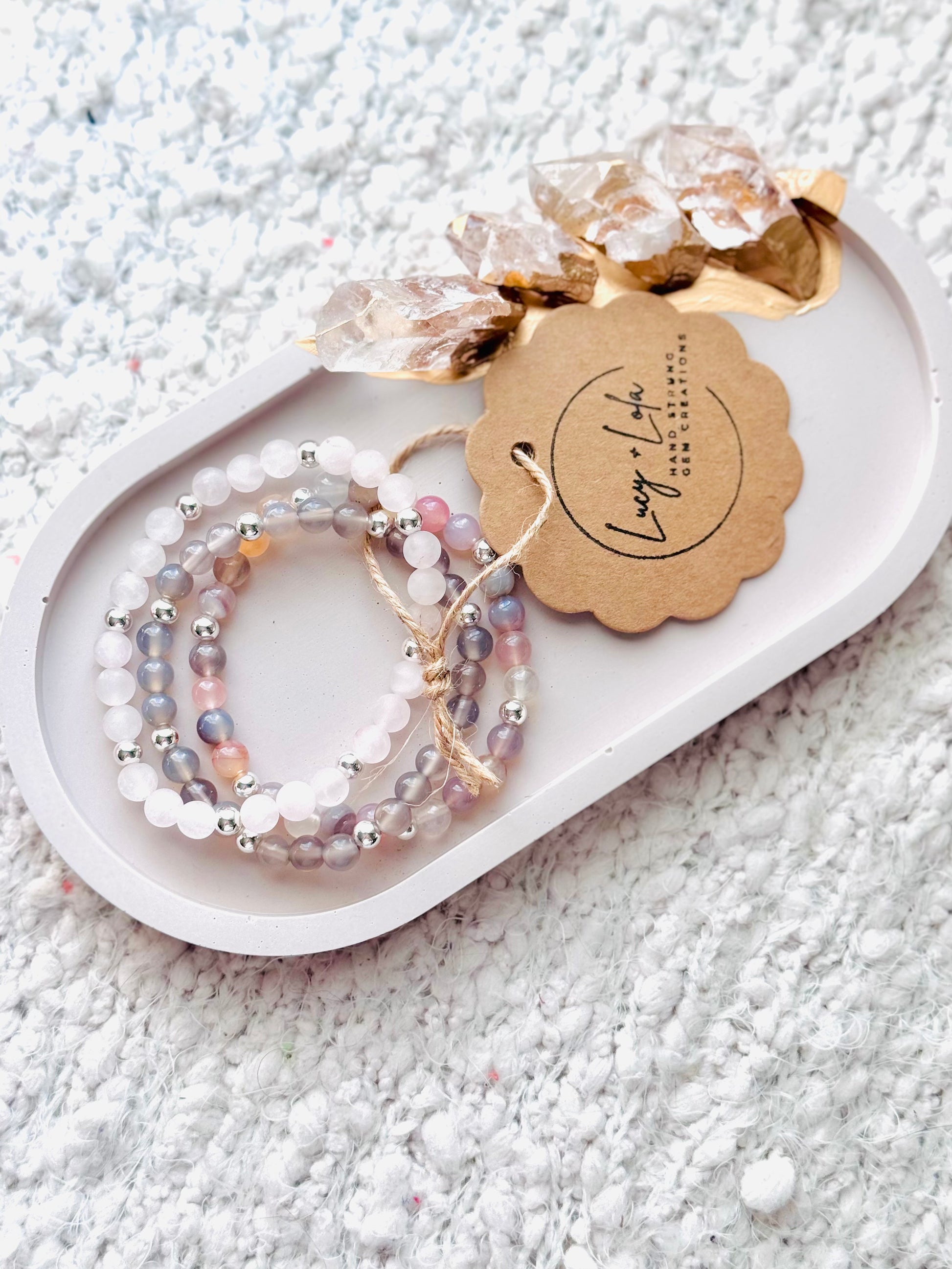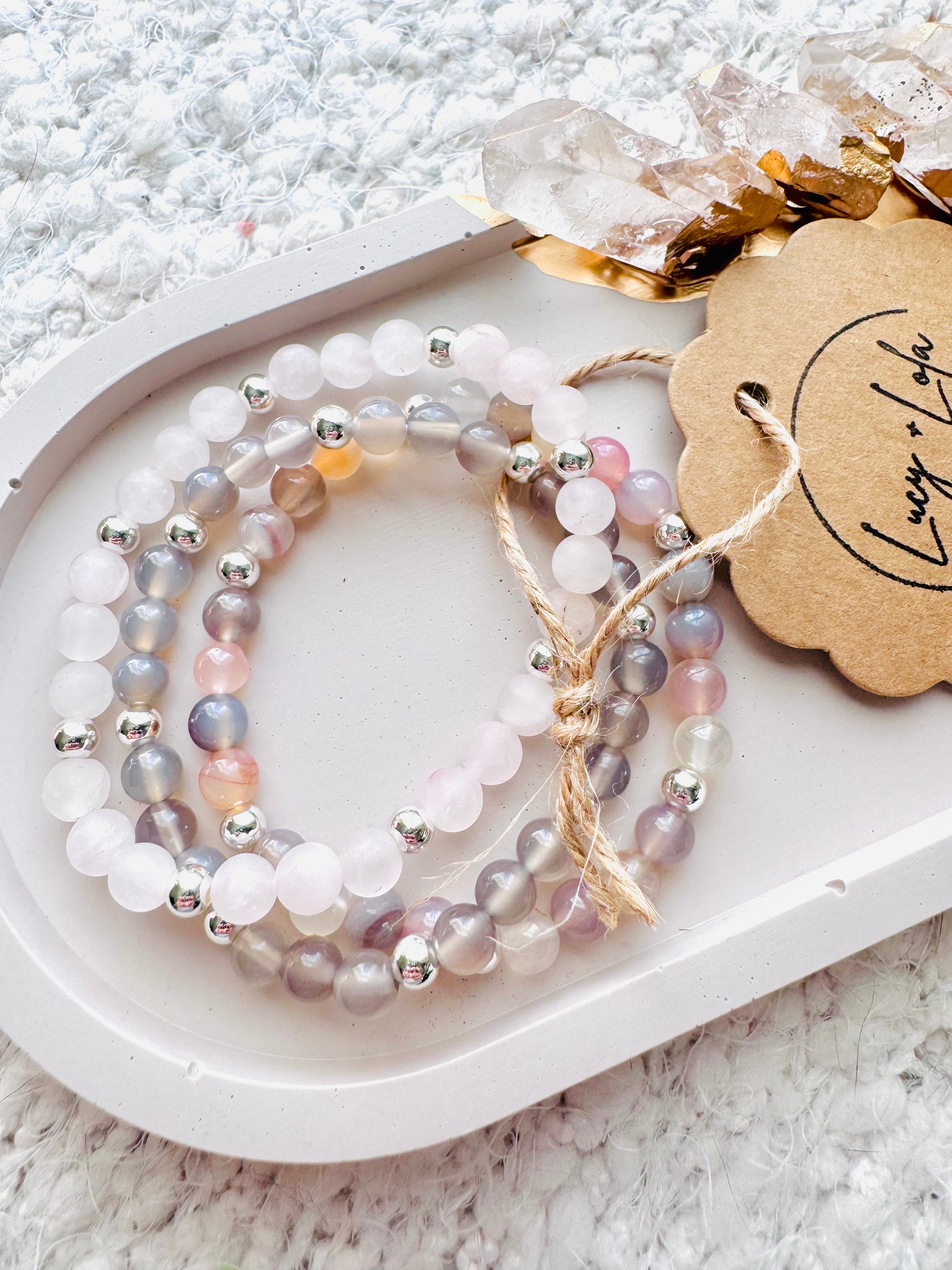 - Beads include: matte rose quartz, Mozambique agate, gray agate