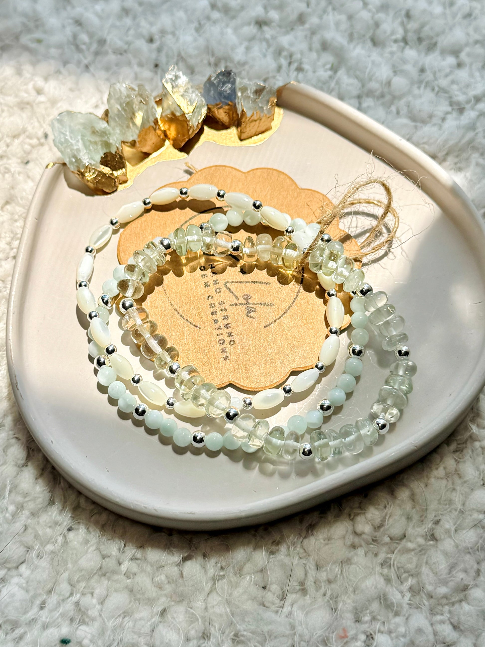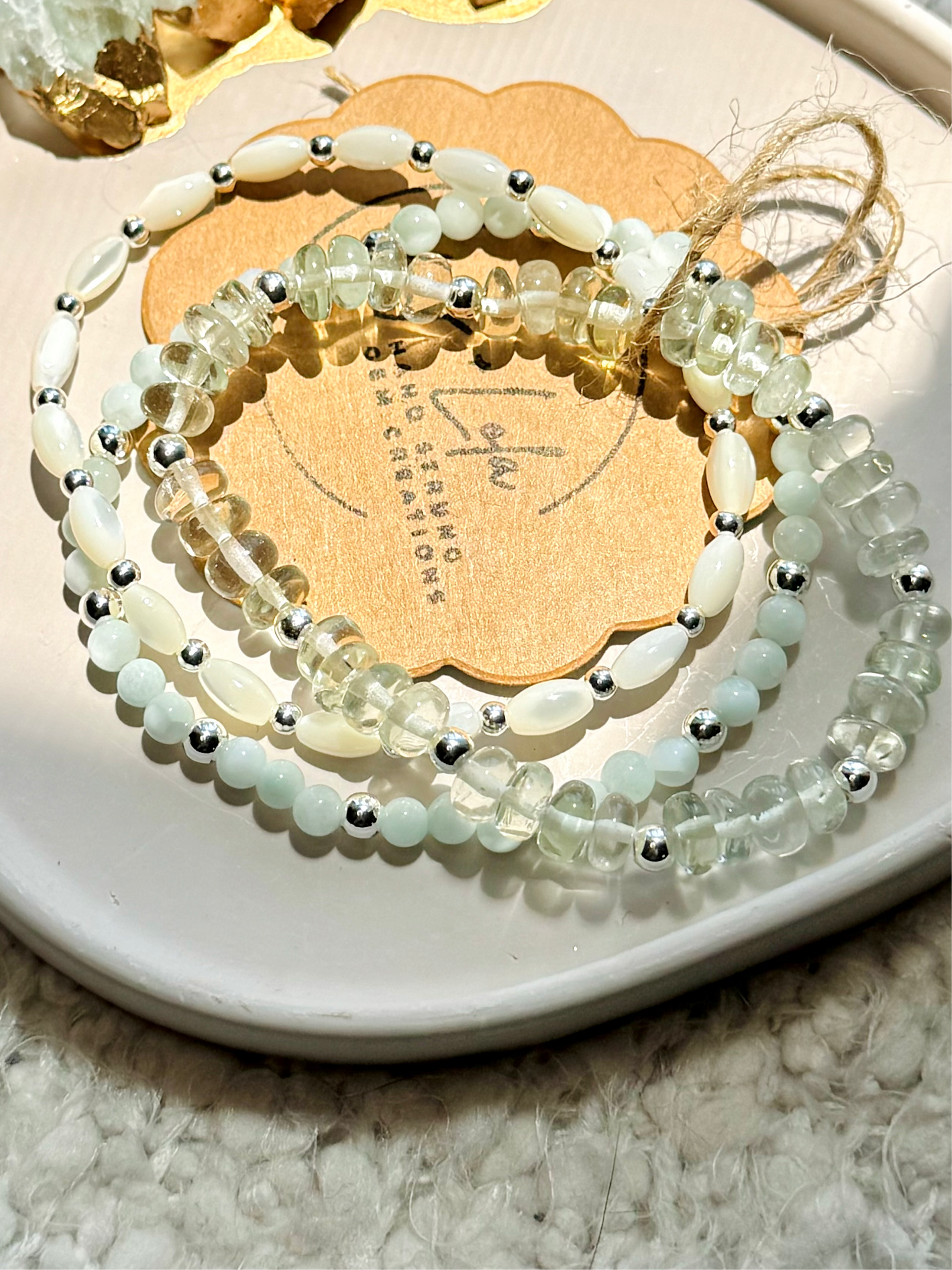 - Beads include: mother of pearl, green moonstone + green amethyst