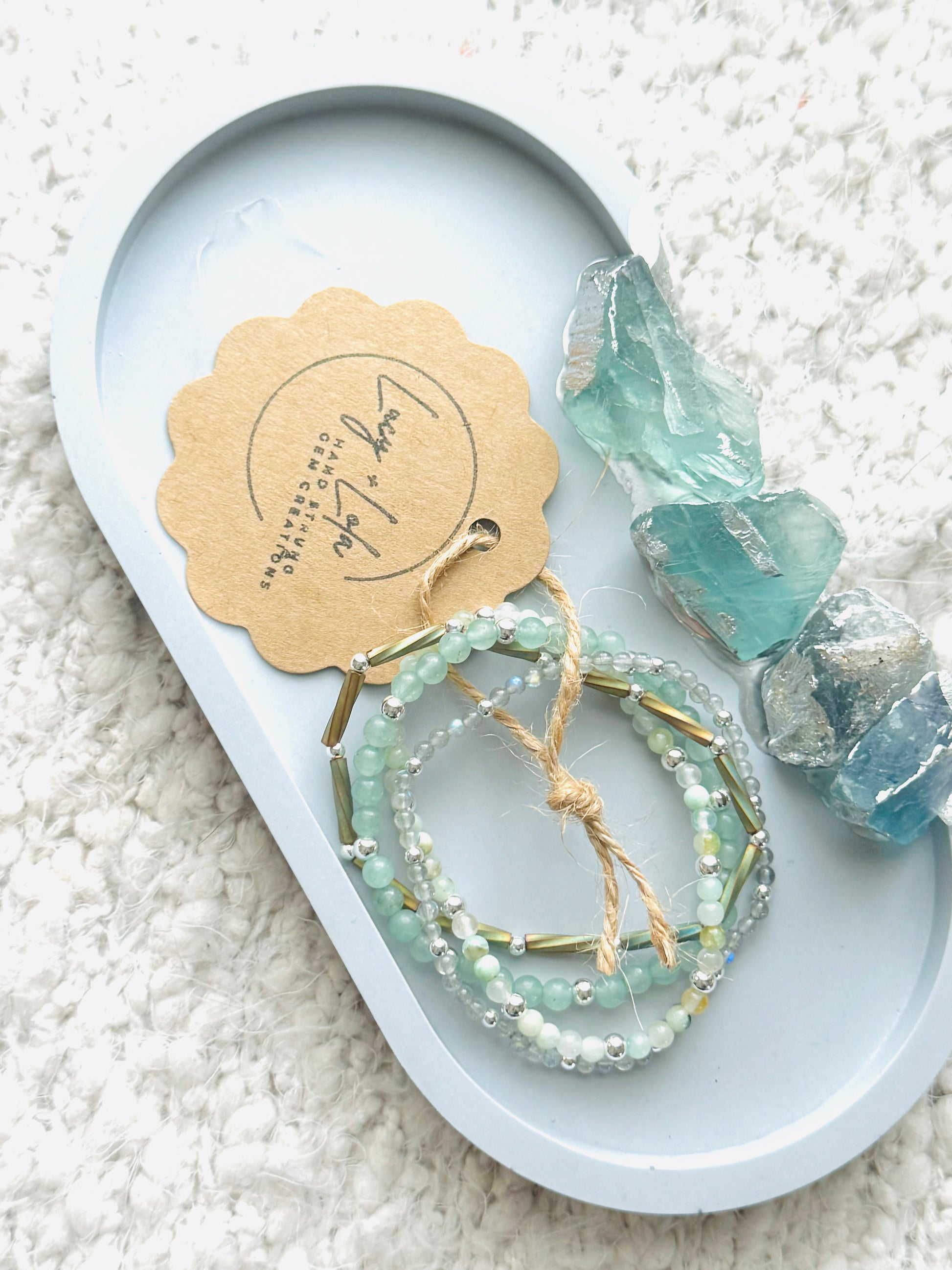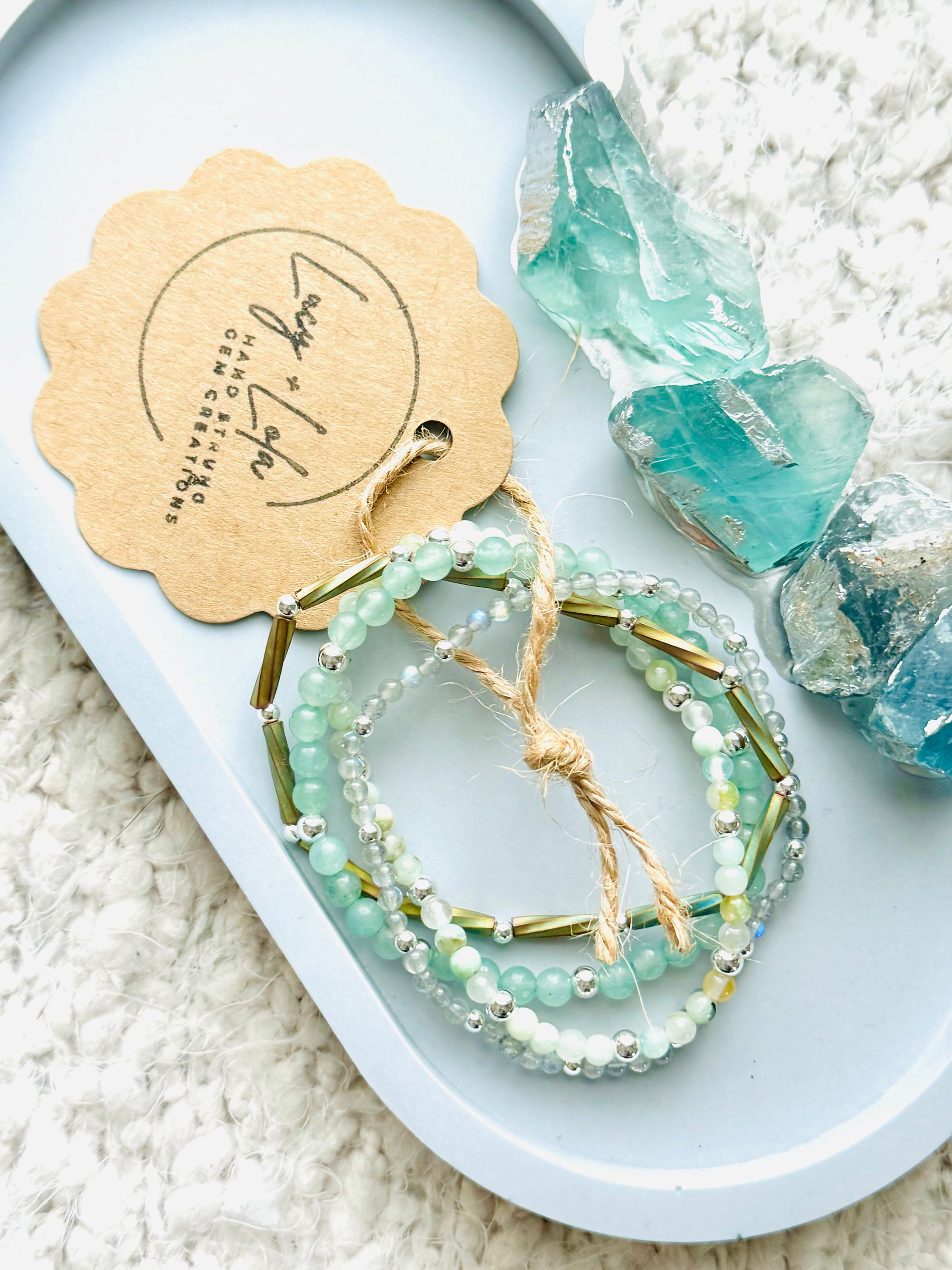- Beads include: chrysocolla, green aventurine, Miyuki glass + labradorite