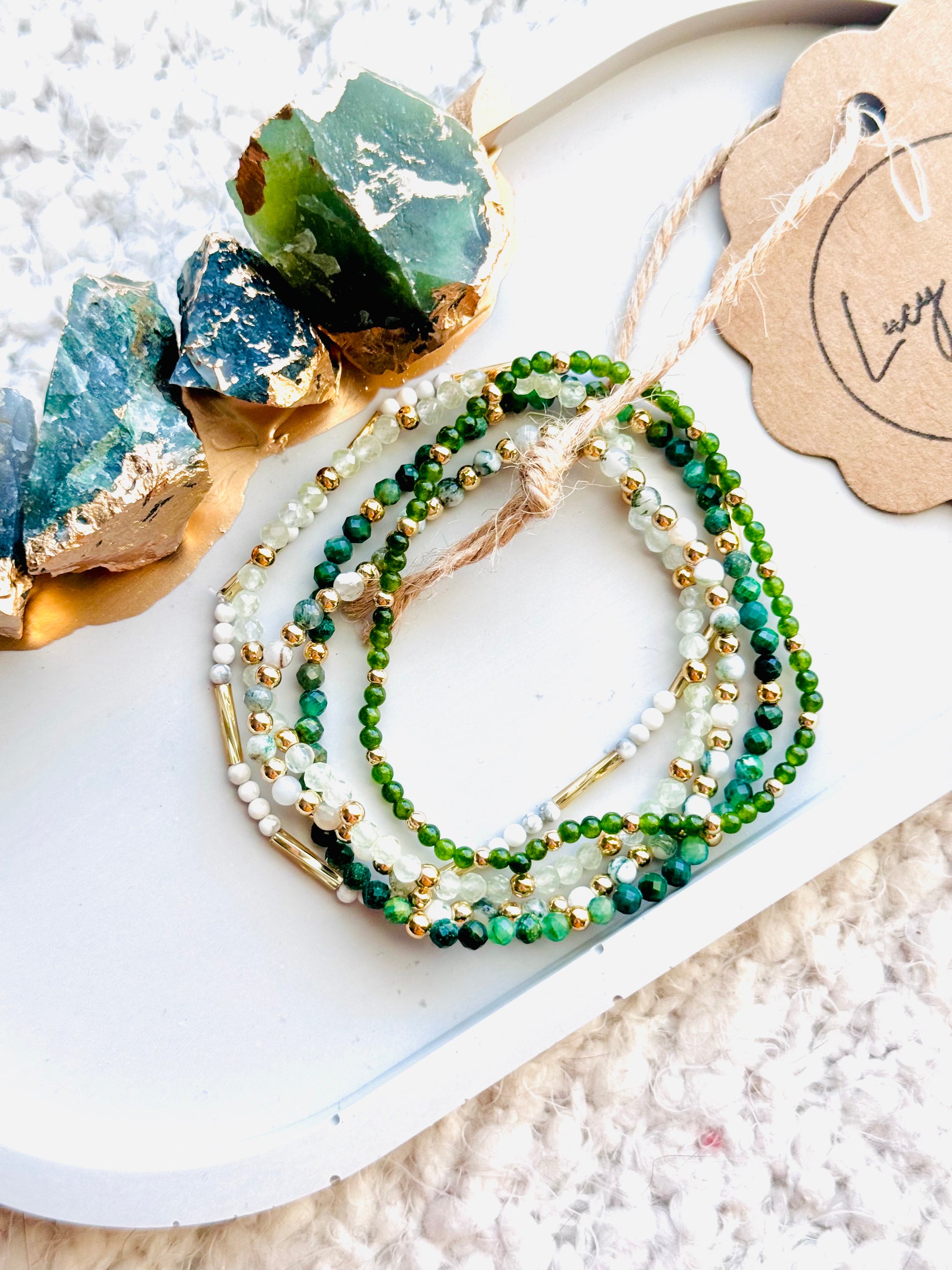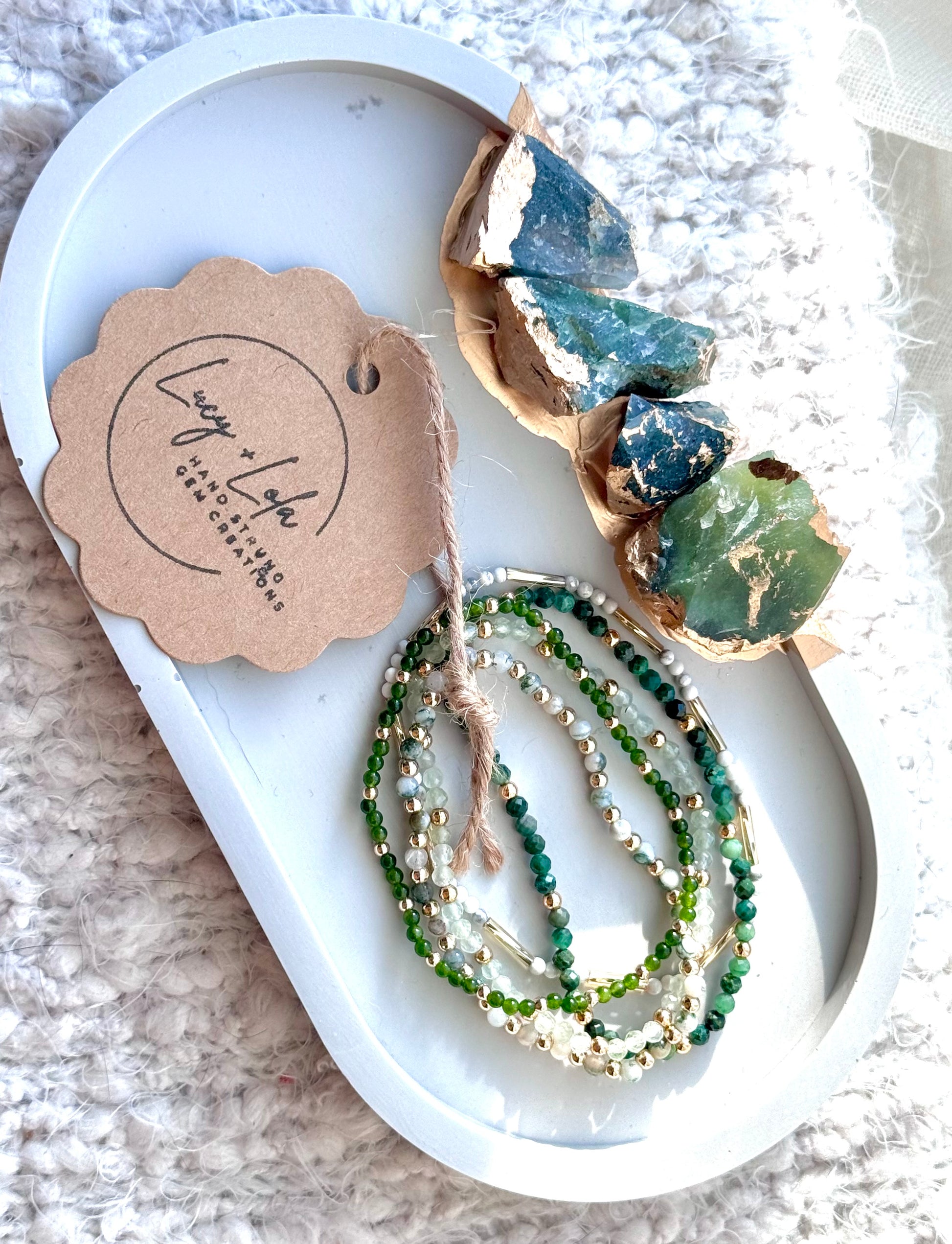 - Beads include: tree agate, African Jade, howlite, dark green Jade, prehnite