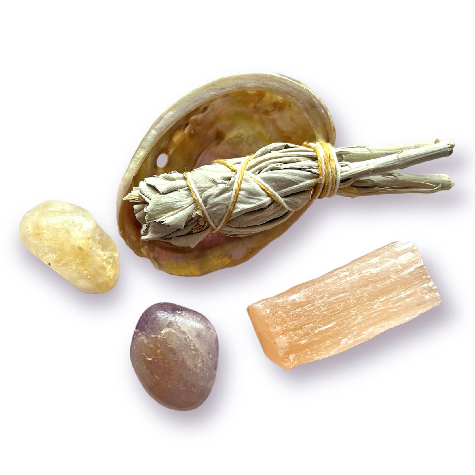 Includes: Mini sage to clear negativity Mini shell to hold embers, Citrine a stone for joy, Peach selenite to cleanse and recharge, Amethyst to embrace the magic of the everyday.