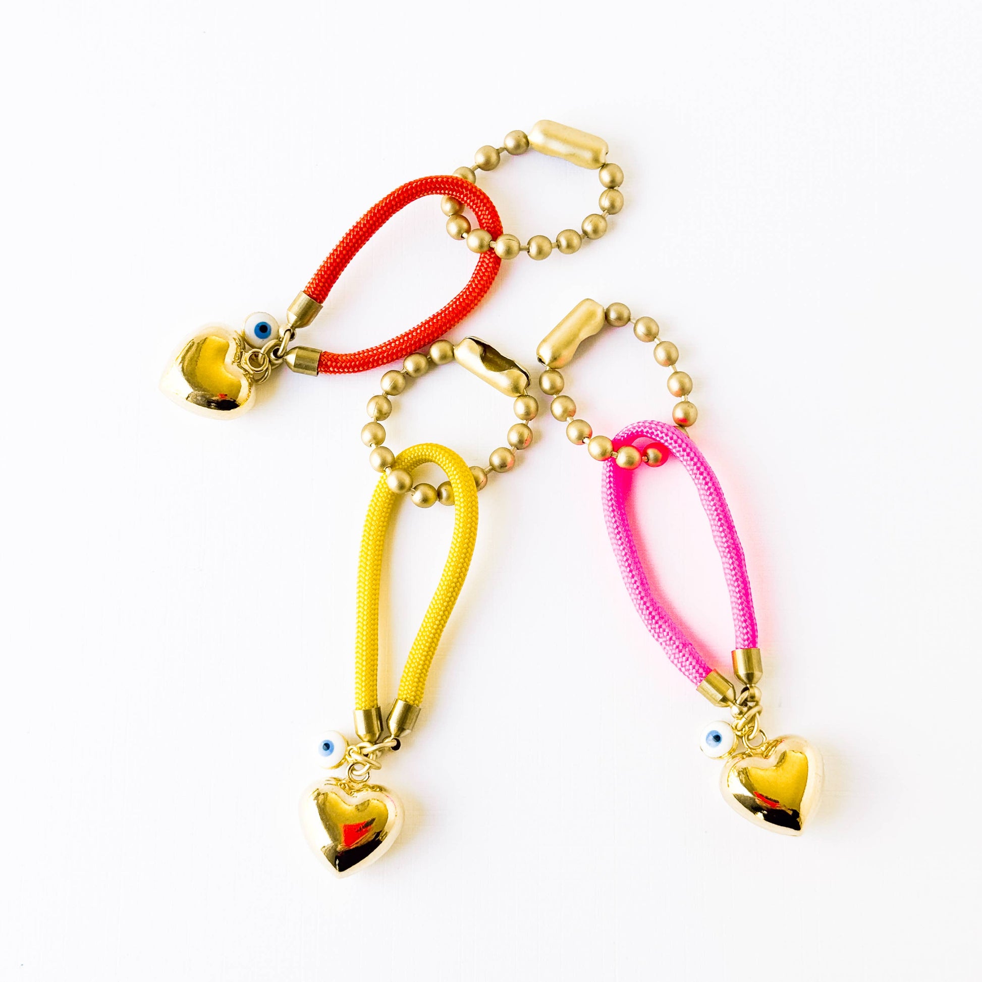 Includes a 24K matte gold plated ball chain, Paracord, 24K Gold plated puffy heart and Evil eye charm.